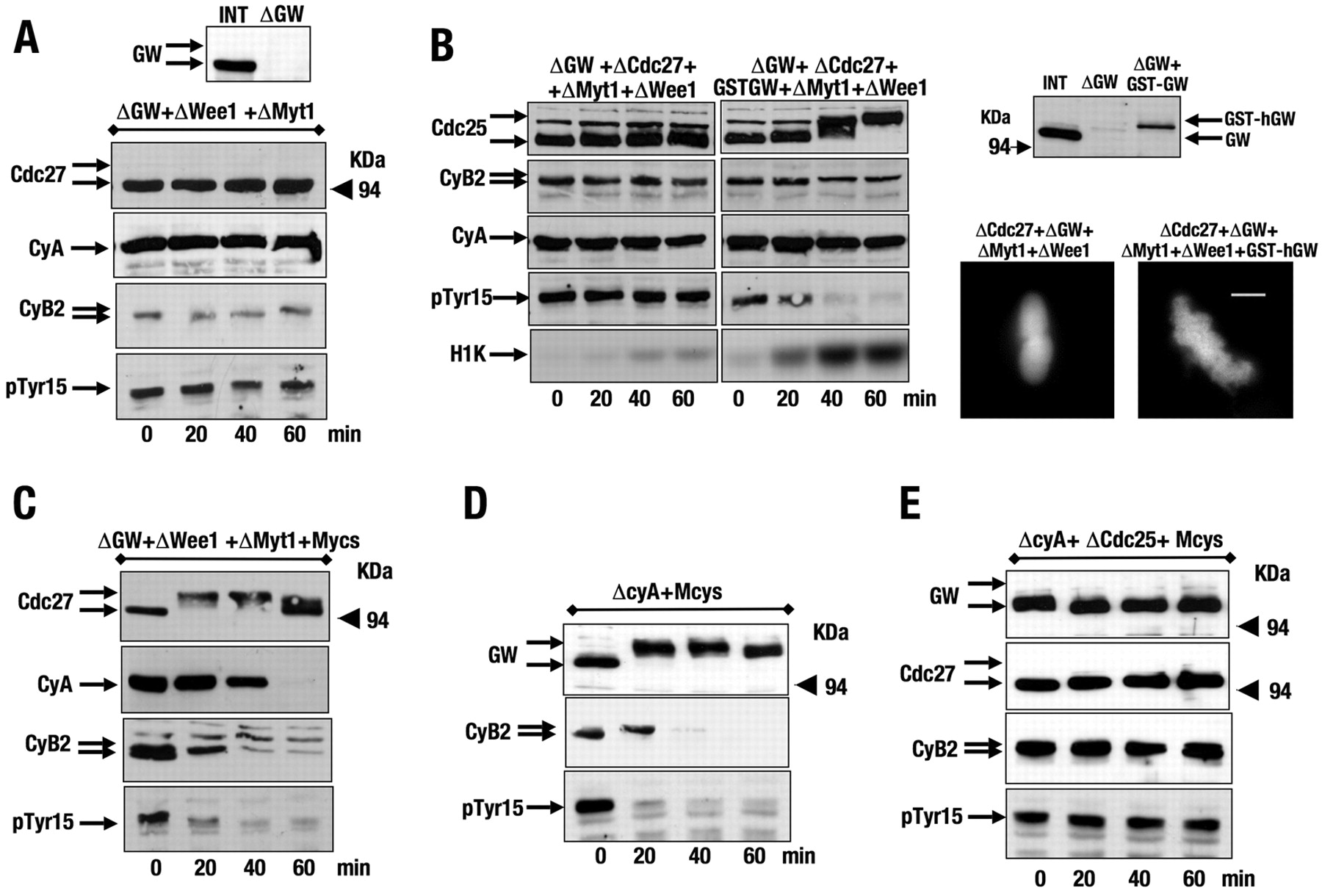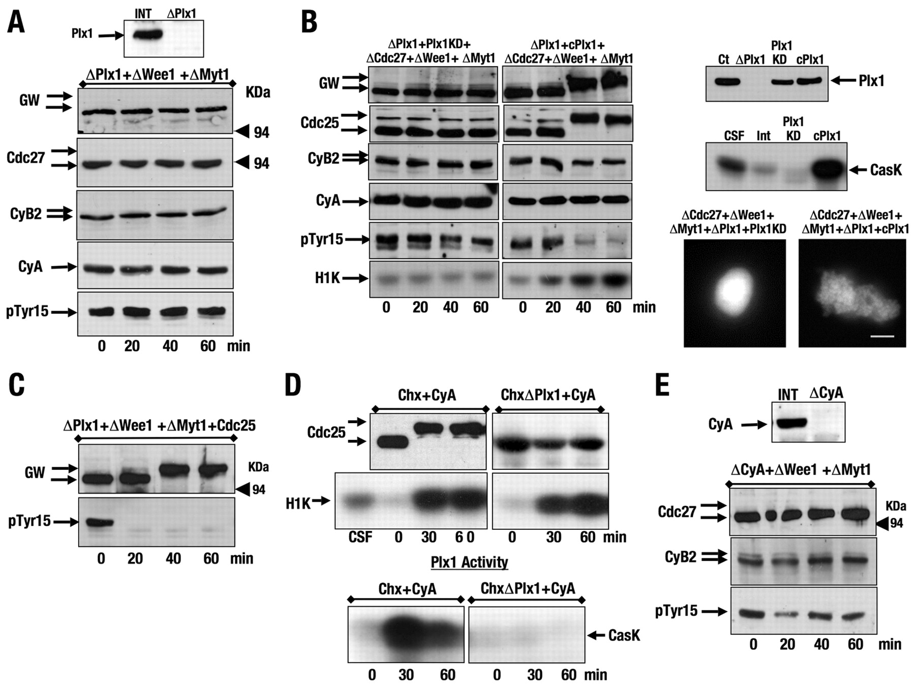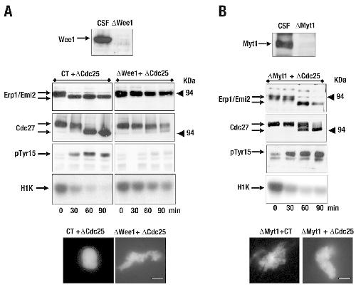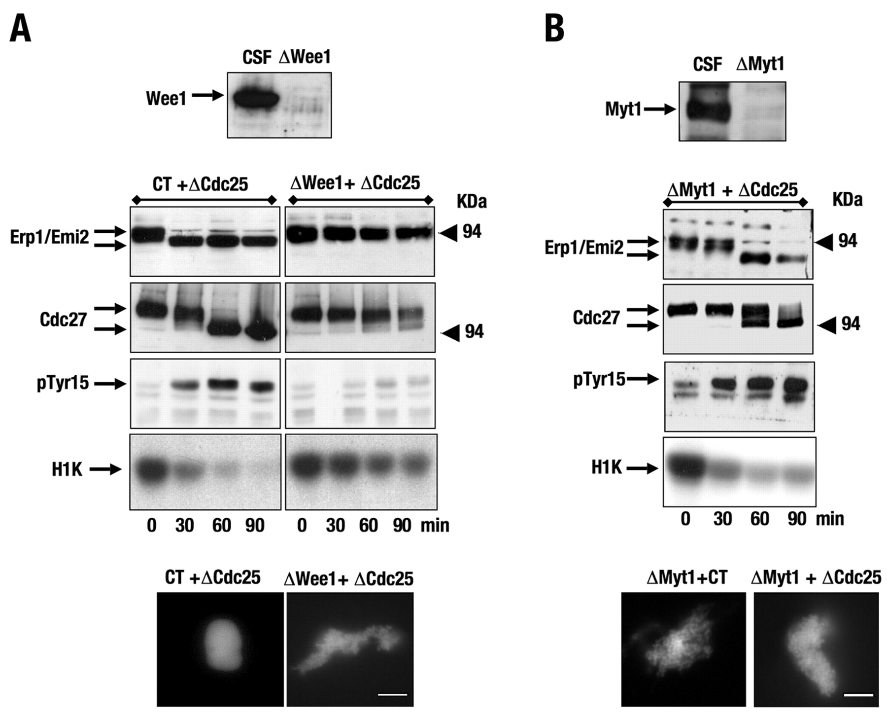 Cdc25 is continuously counterbalancing Wee1 and Myt1 to maintain the mitotic state. (A) 30 μl CSF extract was immunoprecipitated once with control or Wee1 antibodies, and subsequently immunoprecipitated twice with anti-Cdc25 antibodies. Immunodepletion efficacy is shown by western blot. Supernatants were then removed at the indicated times and used to analyse phosphorylation of Erp1 (Emi2), Cdc27, phospho-Tyr15 of Cdc2 (pTyr15), as well as cyclin-B–Cdc2 activity and chromatin condensation. (B) CSF extracts were treated as described in A, except for the depletion of Myt1 instead of Wee1 before Cdc25 immunoprecipitation. Scale bars: 5 μm.