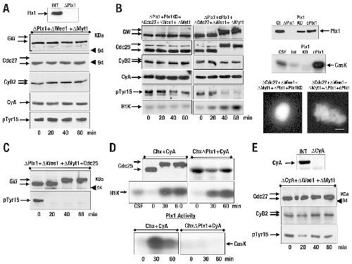 Mitotic entry induced by Wee1 or Myt1 depletion is dependent on cyclin-A–Cdk and Plx1 kinases. (A) Interphase extracts were immunodepleted of Plx1, Wee1 and Myt1 proteins, and mitotic entry was investigated by western blot. Plx1 levels in control and Plx1-immunoprecipitated extracts are shown. (B) Interphase extracts were depleted of endogenous Plx1 by a double immunoprecipitation and supplemented with the mRNA encoding a kinase-dead or a constitutively active form of Plx1 (Qian et al., 1999). These extracts were used as a source of kinase-dead or constitutively active Plx1 protein. Another pool of interphase extracts was immunoprecipitated twice with Plx1 antibodies and subsequently supplemented with 10% of either kinase-dead or constitutively active Plx1 translated extracts. The mix was subsequently depleted of Cdc27, Wee1 and Myt1 proteins, and mitotic entry was analysed by western blot. The levels and activities of the different Plx1 proteins (endogenous and translated kinase-dead and constitutive Plx1) were investigated by western blot and by using anti-Plx1 immunoprecipitates and casein as a substrate. DNA condensation was analysed by light microscopy. (C) Similar to A, except for the addition of recombinant human Cdc25B-MBP protein to the extracts just after immunoprecipitation (5 ng/μl Cdc25b-MBP). (D) Cycloheximide (Chx)-treated interphase extracts were first depleted (ΔPlx1) or not with anti-Plx1 antibodies, and subsequently supplemented with a final concentration of 60 nM human cyclin A (CyA). Samples of 1 μl were removed after Plx1 depletion and before cyclin A addition (0 minutes) or 30 and 60 minutes after cyclin A addition. The phosphorylation pattern of Cdc25 was studied by western blot, whereas cyclin-A–Cdk activity was measured by H1K activity. To compare the activity of ectopic cyclin-A–Cdc2 and endogenous cyclin-B–Cdc2, a sample of a CSF extract was used to measure H1K activity. Plx1 activity in cycloheximide interphase extracts was measured in vitro using anti-Plx1 immunoprecipitates and casein as a substrate. (E) Similar to A, except for the depletion of cyclin A instead of Plx1. The levels of cyclin A left in the supernatants after depletion are shown. Scale bar: 5 μm.