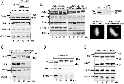 The regulation of phosphatases is also essential to maintain correct timing of mitosis in the first embryonic cell cycle. (A) Interphase extracts were depleted of Greatwall (GW), Myt1 and Wee1, and mitotic entry was determined by analysing the phosphorylation of the indicated proteins. The efficacy of anti-Greatwall antibodies to immunodeplete this protein is shown. (B) Interphase extracts were depleted of Greatwall and Cdc27 proteins. The supernatants were then supplemented with GST-Greatwall recombinant protein and immunoprecipitated again with anti-Wee1 and anti-Myt1 antibodies to deplete these two proteins. Mitotic entry was then analysed by western blot. The levels of endogenous and recombinant GST-Greatwall proteins are shown. (C) Similar to A, except for the addition of 800 nM of the PP2A inhibitor microcystin (Mycs) after protein depletion. (D) Interphase extracts were first depleted of cyclin A and subsequently supplemented with 800 nM microcystin. (E) Interphase extracts were immunoprecipitated with anti-cyclin A and anti-Cdc25 antibodies, and subsequently supplemented with 800 nM microcystin. Mitotic entry was analysed by western blot. Scale bar: 5 μm.