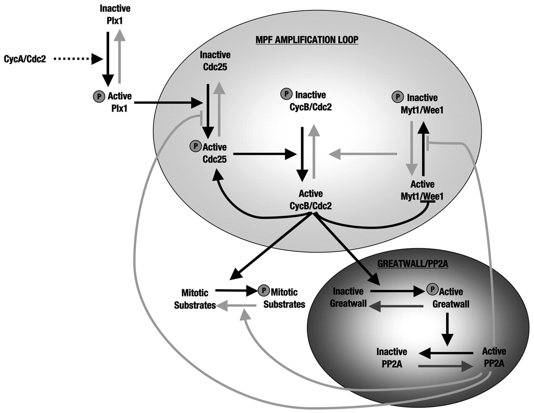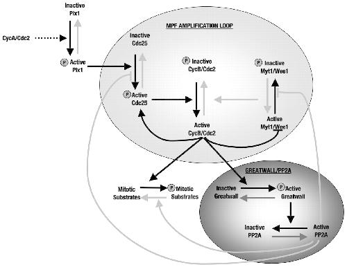 Hypothetical model showing the different steps required for mitotic entry. During interphase, cyclin-A–Cdc2 will accumulate and will promote partial Cdc25 activation through Plx1 activation. Partial activity of Cdc25 will promote the activation of a burst of cyclin-B–Cdc2, which will trigger the MPF amplification loop. Complete activation of cyclin-B–Cdc2 will promote the activation of Greatwall, which will subsequently induce PP2A inhibition, thus permitting phosphorylation of mitotic substrates by MPF and mitotic entry. Black arrows denote the pathways active at mitotic entry. Grey arrows denote pathways active during interphase. The dotted arrow indicates that the pathway can be direct or indirect.