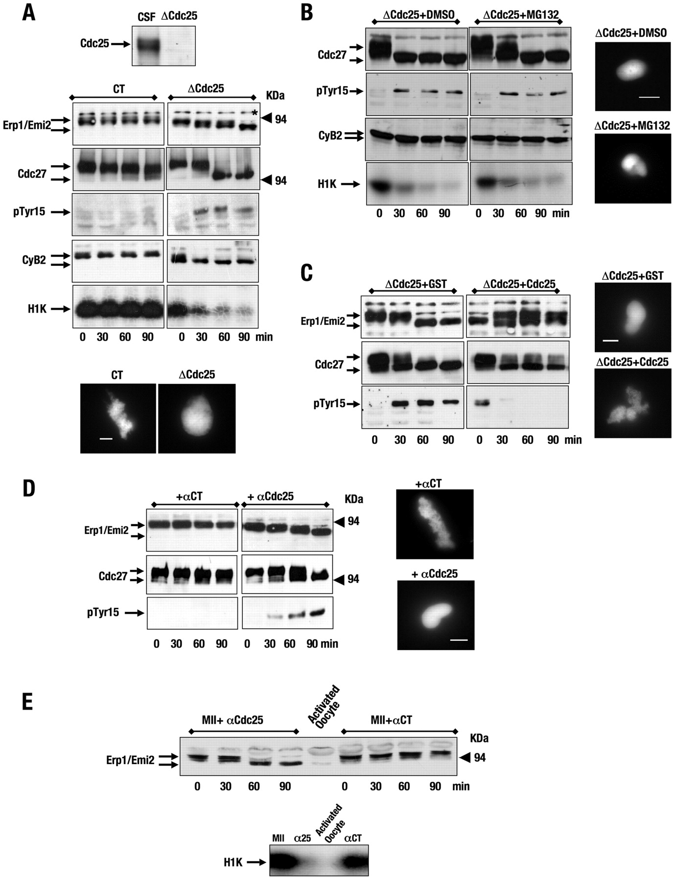 Cdc25 activity is required to maintain an active MPF kinase in CSF extracts and metaphase-II-arrested oocytes. (A) Two successive 15-minute immunoprecipitations with control (CT) or anti-Cdc25 (ΔCdc25) antibodies were developed in 30 μl CSF extract, as described in Materials and Methods. 1 μl CSF extract and 1 μl supernatant were analysed by western blot to verify the immunodepletion of this protein. Time points of 1 μl supernatant were removed at 0, 30, 60 and 90 minutes after the second immunoprecipitation and used either for western blot to visualise Erp1 (Emi2), Cdc27, phospho-Tyr15 of Cdc2 (pTyr15) and cyclin B2 (cyB2), or for measuring cyclin-B–Cdc2 activity by histone H1 kinase assay (H1K). 1000-2000 sperm nuclei per microlitre was added to 10 μl supernatant after immunoprecipitation and incubated for 90 minutes. After fixation of the samples with 1% formaldehyde containing DAPI (1 μg/ml), 1 μl sample was used to visualise chromatin condensation by light microscopy (bottom). (B) CSF extracts were supplemented with 0.7 μl proteasome inhibitor MG132 (final concentration 1 mM) or the same volume of DMSO. 15 minutes later, they were depleted with anti-Cdc25 antibodies as in A. (C) CSF extracts were immunoprecipitated with anti-Cdc25 antibodies and were subsequently supplemented with either GST or GST-Cdc25 recombinant protein. Samples were removed at the indicated time points to study the phosphorylation pattern of Erp1 (Emi2), Cdc27 and Tyr15 of Cdc2. Sperm nuclei were added to immunodepleted Cdc25 CSF extracts after the addition of GST or the GST-Cdc25 recombinant protein, and DNA condensation was analysed by light microscopy. (D) CSF extracts were incubated for 5 minutes with control (αCT) or anti-Cdc25 antibodies (αCdc25). Subsequently, samples were removed to perform western blots and to analyse DNA condensation. (E) Metaphase-II-arrested oocytes were microinjected with either control (MII+αCT) or anti-Cdc25 antibodies (MII+αCdc25) in an MMR buffer (see Materials and Methods) supplemented with 5 mM EGTA to prevent oocyte activation by microinjection. One oocyte was lysed by time point and used to analyse the phosphorylation pattern of Erp1 (Emi2) by western blot. Activated oocytes were obtained by microinjecting buffer in the presence of an MMR buffer without EGTA. Cyclin-B–Cdc2 activity was measured in non-injected (MII), activated (activated oocytes), anti-Cdc25 (α25) and control-injected (αCT) oocytes 90 minutes after microinjection by H1 kinase assay (H1K). Scale bars: 5 μm.
