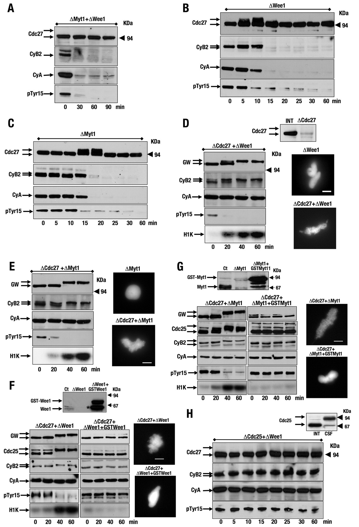 The constant activity of Myt1 and Wee1 is required to counterbalance Cdc25 during interphase. (A) Interphase extracts were immunodepleted of Myt1 and Wee1 proteins, and the supernatants were recovered at the indicated times to analyse the state of phosphorylation of the indicated proteins. CyA, cyclin A; CyB2, cyclin B2. (B) Similar to A, except that interphase extracts were only immunodepleted of Wee1 protein. (C) Similar to B, except that anti-Myt1 instead of anti-Wee1 antibodies were used. (D) Interphase extracts (INT) were immunodepleted of Cdc27 and Wee1 proteins. The phosphorylation of the indicated proteins and the cyclin-B–Cdc2 kinase activity were analysed by western blot and by H1 kinase activity, respectively. 1 μl interphase extract and 1 μl supernatant was analysed by western blot to verify the immunodepletion of Cdc27. (E) Similar to D, except for the depletion of Myt1 instead of Wee1. (F) Interphase extracts were first immunoprecipitated with anti-Cdc27 antibodies and subsequently with anti-Wee1 antibodies. After depletion, the supernatants were supplemented with recombinant GST-Wee1 protein. 1 μl interphase extract, supernatant and supernatant supplemented with GST-Wee1 protein were analysed by western blot to investigate the levels of endogenous and recombinant Wee1 protein present in these extracts. The asterisk denotes a band of probably a cleaved GST-Wee1 protein. DNA condensation was analysed as described in Fig. 1A. (G) Similar to F, except for the depletion and the addition of the recombinant protein Myt1 instead of Wee1. (H) Interphase extracts were immunodepleted of Cdc25 and Wee1 proteins, and the phosphorylation of the indicated proteins was analysed by western blot. Phosphorylation of Cdc25 in interphase and CSF extracts is shown. Scale bars: 5 μm.