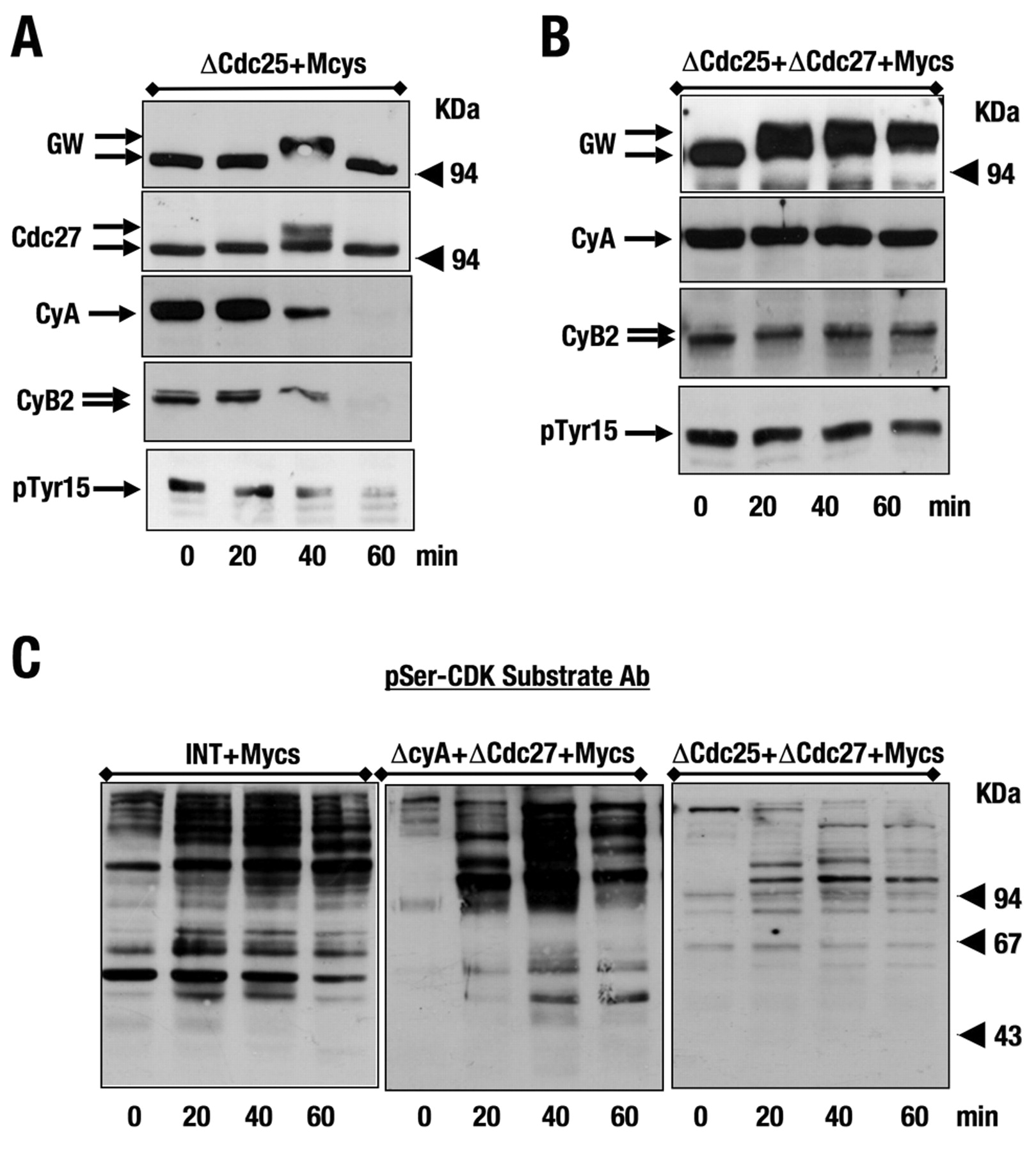 Endogenous cyclin-A–Cdc2 can induce aberrant mitosis when PP2A is prematurely inhibited in interphase egg extracts. (A) Interphase egg extracts were immunodepleted of Cdc25 and subsequently supplemented with 800 nM microcystin. Supernatants were recovered at the indicated times and the phosphorylation state of Greatwall, Cdc27, Cyclin A, Cyclin B2 and Try15 of Cdc2 was analysed by western blot. (B) Similar to A, except that a double depletion of Cdc25 and Cdc27 was performed before microcystin addition. (C) The phosphorylation pattern of cyclin-B–Cdc2 substrates (phospho-serine Cdk substrate Ab) was analysed in interphase extracts supplemented with 800 nM microcystin and in interphase extracts previously depleted of cyclin A and Cdc27, or Cdc25 and Cdc27, and subsequently supplemented with the same dose of microcystin.