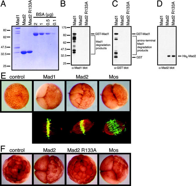 In cells containing disrupted spindles, the spindle assembly checkpoint arrests the cell cycle in metaphase. The budding uninhibited by benzimidazole (Bub) 1, mitotic arrest-deficient (Mad) 1, and Mad2 proteins promote this checkpoint through sustained inhibition of the anaphase-promoting complex/cyclosome. Vertebrate oocytes undergoing meiotic maturation arrest in metaphase of meiosis II due to a cytoplasmic activity termed cytostatic factor (CSF), which appears not to be regulated by spindle dynamics. Here, we show that microinjection of Mad1 or Mad2 protein into early Xenopus laevis embryos causes metaphase arrest like that caused by Mos. Microinjection of antibodies to either Mad1 or Mad2 into maturing oocytes blocks the establishment of CSF arrest in meiosis II, and immunodepletion of either protein blocked the establishment of CSF arrest by Mos in egg extracts. A Mad2 mutant unable to oligomerize (Mad2 R133A) did not cause cell cycle arrest in blastomeres or in egg extracts. Once CSF arrest has been established, maintenance of metaphase arrest requires Mad1, but not Mad2 or Bub1. These results suggest a model in which CSF arrest by Mos is mediated by the Mad1 and Mad2 proteins in a manner distinct from the spindle checkpoint.