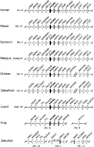 In humans and mice, the early development of αβ T cells is controlled by the pre-T-cell receptor α chain (pTα) that is covalently associated with the T-cell receptor β (TCRβ) chain to form the pre-T-cell receptor (pre-TCR) at the thymocyte surface. Pre-TCR functions in a ligand-independent manner through self-oligomerization mediated by pTα. Using in silico and gene synteny-based approaches, we identified the pTα gene (PTCRA) in four sauropsid (three birds and one reptile) genomes. We also identified 25 mammalian PTCRA sequences now covering all mammalian lineages. Gene synteny around PTCRA is remarkably conserved in mammals but differences upstream of PTCRA in sauropsids suggest chromosomal rearrangements. PTCRA organization is highly similar in sauropsids and mammals. However, comparative analyses of the pTα functional domains indicate that sauropsids, monotremes, marsupials, and lagomorphs display a short pTα cytoplasmic tail and lack most residues shown to be critical for human and murine pre-TCR self-oligomerization. Chicken PTCRA transcripts similar to those in mammals were detected in immature double-negative and double-positive thymocytes. These findings give clues about the evolution of this key molecule in amniotes and suggest that the ancestral function of pTα was exclusively to enable expression of the TCRβ chain at the thymocyte surface and to allow binding of pre-TCR to the CD3 complex. Together, our data provide arguments for revisiting the current model of pTα signaling.