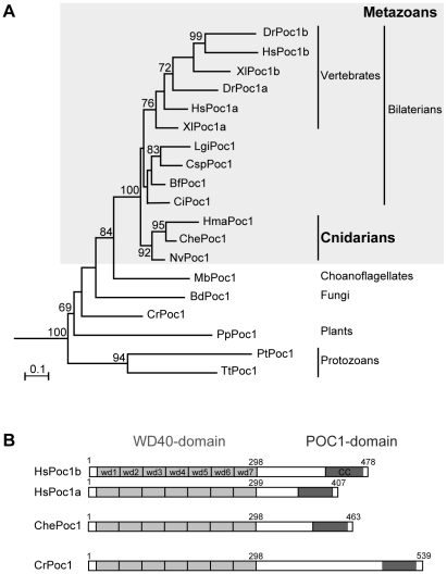 Figure 1. A highly conserved Poc1 in Clytia.A. Phylogenetic relationships between eukaryotic Poc1 sequences, deduced by Maximum likelihood (see Materials and Methods). Sequences from the closely related WD40-repeat containing Lis1 proteins, present in the same range of taxa, were included as an out-group. Bootstrap percentages (500 replicates) over 50% are shown. Bd = Batrachochytrium dendrobatidis; Bf = Branchiostoma floridae; Ci = Ciona intestinalis; Che = Clytia hemisphaerica; Cr = Chlamydomonas reinhardtii; Csp = Capitella species; Dr = Dario rerio; Hma = Hydra magnipapillata; Hs = Homo sapiens; Lg = Lottia gigantean; Mb = Monosiga brevicollis; Nv = Nematostella vectensis; Pp = Physcomitrella patens; Pt = Paramecium tetraurelia; Tt = Tetrahymena thermophila; Xl = Xenopus laevis. Note that the POC1 gene probably underwent duplication in the vertebrate lineage, with the Poc1a sequence subsequently retaining higher similarity to the ancestral protein. Scale: amino acid substitutions per site. B. Schematic comparison of the ChePoc1 sequence with those of human and Chlamydomonas. All Poc1 proteins contain a characteristic N-terminal domain comprising 7 WD40 repeats and a C-terminal coiled-coil region containing the POC1 domain. |