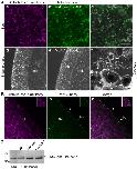 Figure 7. Centrosomes in Poc1-MO embryos.Confocal images of early gastrula-stage embryos stained with Hoechst dye for DNA (a, e, i, m, q), anti-gamma tubulin immunofluorescence (b, f, j, n, r) and Alexa-488-phalloidin for cortically-enriched F actin. In the overlays (d, h, l, p, t) DNA is blue, gamma tubulin purple and F-actin green. Control uninjected embryos (a–h) showed bright gamma tubulin dots (arrows) at the basal bodies of ectodermal cells (bb) and centrosomes of cells undergoing mitosis (prophase: p; metaphase: m; telophase: t). In embryos derived from Poc1-MO eggs (i–t), the size of the cells and the shape of many nuclei were irregular, indicating cell cycle disruption, however regular basal bodies (bb) remained clearly detectable in confocal sections through the apical ectoderm (m–p), and cells undergoing normal mitosis each with two gamma tubulin-rich centrosomes were detectable in deeper confocal planes (q–t). |