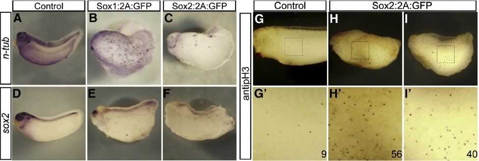 Fig. 8. Sox1:2A:GFP and Sox2:2A:GFP transgenic embryos have decreased levels of n-tub and Sox2:2A:GFP have increased proliferation. (A) WISH for n-tub. (A) A stage 30 sibling embryo generated from sperm nuclei transfer serves as a staging control. N-tub levels are reduced in the brain and spinal cord of transgenic embryos. (B) Sox1:2A:GFP and (C) Sox2:2A:GFP transgenic embryos. (D) WISH for sox2 in stage 30 transgenic Sox1:2A:GFP embryos. Sox2 is not expanded in embryos with small heads or absent heads. (G) Immunohistochemistry for phosphorylated histone H3 immunohistochemistry in Sox2:2A:GFP transgenic embryos. Embryos are shown at the same magnification. Hatched box indicates magnified view. (G′′) pH3 positive cells have been counted in the magnified views. |