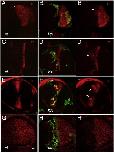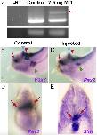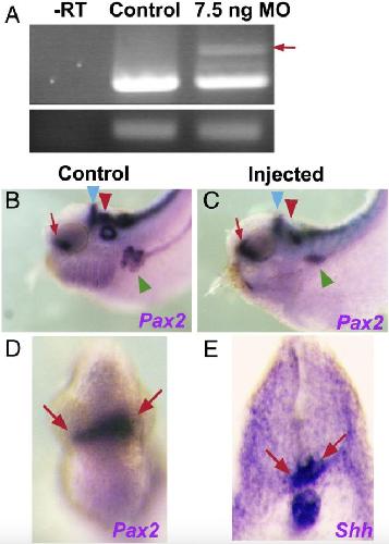 Fig. 7. Expression Pax2 and Shh in stage 35 Xenopus tropicalis embryos injected with MOCHD8. (A) RT-PCR with primers from exons 10 and 14 reveals an extra band of 1127 bp (red arrow) in the embryos injected with 7.5 ng of MOCHD8 that is not observed in the control embryos (compare second and third lanes). (BâD) Pax2 expression in MOCHD8 morphant embryos. (B) Lateral view of the control un-injected side. (C) Lateral view of the MOCHD8-injected side. (D) Frontal view of morphant embryos with the injected side to the right. Note the dorsal expansion of the expression of Pax2 in the eye (red arrows), and the reduction of its expression in the pronephros and hindbrain (green and red arrowheads, respectively). The expression in the midbrain-hindbrain boundary (blue arrowhead) is unaffected. (E) Transverse section of the spinal cord showing Shh expression in embryos injected with 7.5 ng of MOCHD8. The injected side is to the right, and the control, uninjected side, to the left. Note the dorsal expansion of Shh expression in the injected side (right arrow).