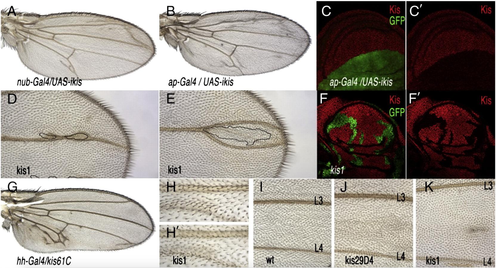Fig. 2. Phenotype of kis loss-of-function clones in the wing. (AâC) Effects of the expression of interference RNA against kis (ikis). Expression of ikis in the wing blade and hinge (nub-Gal4/UAS-ikis; A) or in the dorsal compartment (ap-Gal4/UAS-ikis; B) cause the formation of ectopic longitudinal veins. (CâCâ²) Expression of Kis (red) in ap-Gal4 UAS-GFP/UAS-ikis third instar wing disc. Kis (red in CâCâ²) is not detected in the dorsal compartment (labelled in green in C). (DâE) Example of two kis1 clones (enclosed by black lines) in the dorsal side of the L3 vein, causing non-autonomous formation of L3 vein by wild type cells. (FâFâ²) Loss of Kis expression (red) in kis1 clones located in the wing blade. Clones are labelled by the expression of GFP (green), and were induced in hsFLP1.22 act-Gal4 UAS-GFP; kis1FRT40A/tubGal80 FRT40A larvae. Kis is not detected in kis1mutant cells. (G) Mosaic wing in which the posterior compartment is formed by kis61C mutant cells generated in kis61C FRT40A/M(2)z FRT40A; hh-Gal4/UAS-FLP flies. The posterior compartment is smaller and differentiates ectopic veins. (HâHâ²) High magnification of the dorsal (H) and ventral (Hâ²) side of the L3âL4 intervein showing the formation of ectopic veins by kis1 mutant cells (labelled with forked). (IâK) High magnification of the L3âL4 intervein in a wild type wing (I), and in wings carrying kis clones occupying a small part of the intervein (kis29D4; J) and a large fraction of the same intervein (kis1; K). In both cases there is an increase in the distance between the L3 and L4 veins.