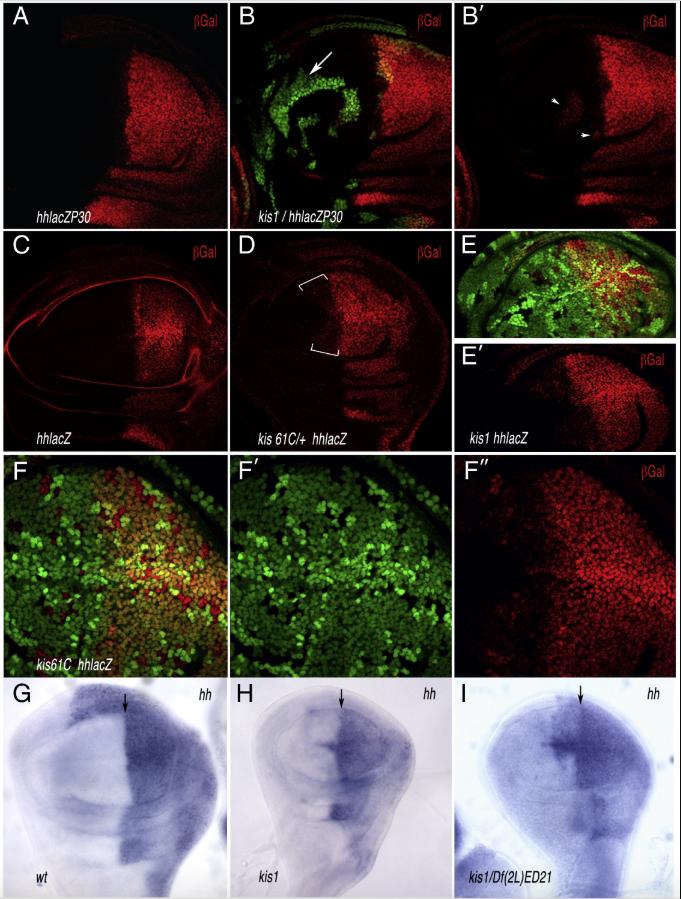 Fig. 4. Expression of hh in kis mutant cells. (A) Expression of βGal (red) in the posterior compartment of hh-lacZP30 / + third instar wing disc. (BâBâ²) Ectopic expression of hh-lacZP30 (red) in kis1 clones located close to the antero-posterior compartment boundary (arrowheads in Bâ²). hh-lacZP30 is not expressed in kis mutant cells located in more anterior regions of the anterior compartment (arrow in B). (C) Expression of βGal (red) in the posterior compartment of hh-lacZ / + third instar wing disc. (D) Expression of βGal (red) in the anterior compartment of kis61C / +; hh-lacZ / + third instar wing disc. hh-lacZ is now also detected at low levels in an anterior domain close to the A/P boundary (bracketed). (EâEâ²) Expression of βGal (red) at higher than background levels in the anterior compartment of hh-lacZ / + third instar wing discs bearing kis1 clones (labelled by the absence of green). (FâFâ³) Cell autonomous de-repression of hh-lacZ in small kis mutant clones induced in hsFLP1.22 / +; kis61C FRT40A / tubGFP FRT40A; hh-lacZ / + larvae. In EâFâ² LacZ is detected at higher levels in all kis mutant cells located close to the A/P compartment boundary. (GâI) Expression of hh mRNA in the posterior compartment of wild type discs (G) and de-repression of hh in anterior cells of kis1 homozygous (H) and kis1 / Df(2L)ED21 (I) mutant discs. The position of the A/P boundary is indicated by a black arrow in GâI.