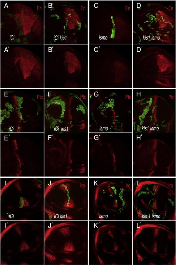 hsFLP1.22 actGal4UAS-GFP; kis1FRT40A / tubGal80FRT40A;UAS-ismo / + (ismo kis1: D, H and L). In all cases, mutant clones were labelled by the expression of GFP (green). The expression of En (AâD and Aâ²âDâ²), Ptc (EâH and Eâ²âHâ²) and Iro (IâL and Iâ²âLâ²) is shown in red. The red channels of AâL are shown in Aâ²âLâ², respectively. The reduction of Ci (iCi) causes loss of En (AâAâ²) and Ptc (EâEâ²) and cell-autonomous ectopic expression of Iro (IâIâ²). When kis is also mutated, the main difference is the strong non-autonomous expression of Ptc (FâFâ²) and Iro-C (JâJâ²). The reduction in Smo causes loss of En (CâCâ²), Ptc (GâGâ²) and Iro (KâKâ²). The same changes are observed in ismo cells mutant for kis1 (DâDâ², HâHâ² and LâLâ²).