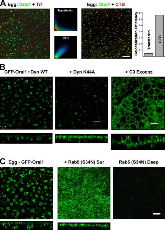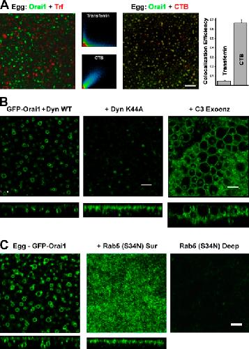 Figure 2. Orai1 internalization endocytic pathway. (A) Oocytes expressing GFP-Orai1 were stained with 125 µg/ml Alexa Flour 633 transferrin (Trf) or 5 µg/ml Alexa Fluor 555 CTB at the GVBD stage and allowed to complete maturation. Colocalization efficiency was measured using ZEN2008 (n = 14). Error bars indicate mean ± SEM. (B) Wild-type dynamin (WT Dyn) or the K44A mutant (30 ng/cell) were injected in GFP-Orai1âexpressing cells and allowed 24 h to express before inducing maturation. C3 exoenzyme (1.7 ng/cell) was injected into GFP-Orai1âexpressing cells 1 h before maturation. Images are from a focal plane â¼2-µm deep from the cell surface. Orthogonal sections are also shown. (A and B) Bars, 10 µm. (C) Oocytes were injected with GFP-Orai1 alone or with 20 ng of the dominant-negative Rab5 (S34N) and then matured. Images show a deep (â¼2 µm into the cell) focal plane (left) or the cell surface as indicated, with the corresponding orthogonal sections. Bar, 5 µm. |