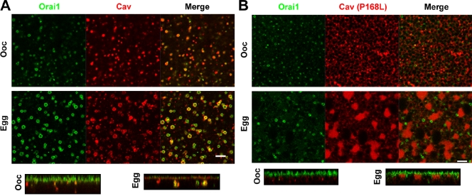 Figure 5. Cav is required for Orai1 internalization. (A) 10 ng GFP-Orai1– and mCherry-Cav–expressing oocytes and eggs. Images are ∼2-µm deep into the cell. Orthogonal sections are also shown. (B) GFP-Orai1 was allowed to express and traffic normally for 24 h followed by expression of 10 ng of the dominant-negative Cav mutant P168L 24 h before maturation. Bars, 5 µm. |