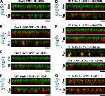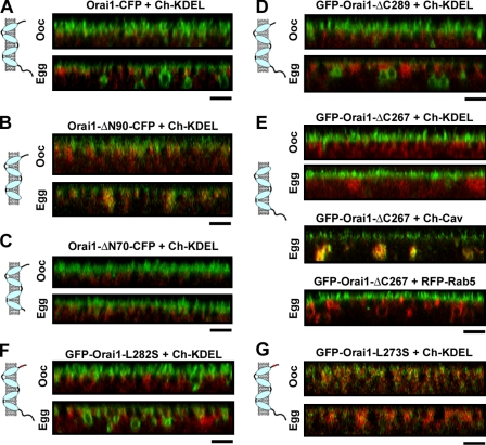 Figure 7. Domains involved in Orai1 trafficking. Orthogonal sections and cartoon representation for the different constructs as indicated. (A–C) Orai1 or N-terminal deletion mutants Orai1-ΔN90 and Orai1-ΔN70 tagged with CFP at the C terminus (5 ng RNA/cell) were coexpressed with Cherry-KDEL. (D) GFP-Orai1-ΔC289 (2 ng RNA/cell) is shown. (E) GFP-Orai1-ΔC267 alone or coexpressed with Cherry-Cav or RFP-Rab5. (F) GFP-Orai1-L282S traffics normally. (G) GFP-Orai1-L273S is trapped in the ER. Bars, 5 µm. |