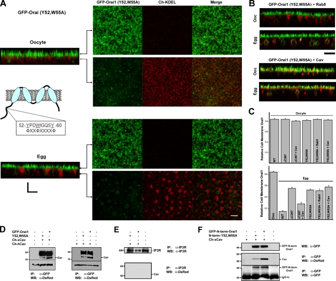 Figure 8. Identification of a Cav-binding site in the Orai1 N terminus. (A) The Cav consensus–binding site is illustrated in the cartoon. Cells expressing GFP-Orai1-Y52,W55A and Cherry-KDEL are shown. Planes at which the images were taken along the z stack are indicated in the orthogonal section. (B) Expression of Rab5 or Cav with Orai1-Y52,W55A does not restore its ability to internalize during meiosis. (C) Relative cell membrane Orai1 was measured as the percentage of GFP fluorescence signal on plasma membrane versus total (n = 9–38). WT, wild type. Error bars indicate mean ± SEM. (D) Orai1 was immunoprecipitated (IP) using anti-GFP antibodies from oocytes expressing 10 ng human (Ch-hCav) or Xenopus (Ch-xCav) Cav-1 with wild-type Orai1 or GFP-Orai1-Y52,W55A. Con indicates uninjected cells. Western blots (WB) were performed using anti-DsRed antibodies. The Cav band is indicated, also shown is a nonspecific band (∼33 kD) that reacts on the Western blot as a loading control. (E) Immunoprecipitation of the IP3 receptor (IP3R) as a nonspecific antigen does not pull down Cav, showing the specificity of the anti-GFP immunoprecipitation. (F) Oocytes were injected with GFP–N-term–Orai1, which contains residues 1–90 of Orai1. Cells were injected with wild-type GFP–N-term–Orai1 or a mutant with residues Y52 and W55 mutated to Ala (N-term–Y52,W55A). Immunoprecipitation was performed with an anti-GFP antibody and Western blots with either an anti-DsRed or anti-GFP as indicated. A Western blot of the different treatments is also shown (top). (D and F) Black lines indicate that intervening lanes have been spliced out. Bars, 5 µm. |