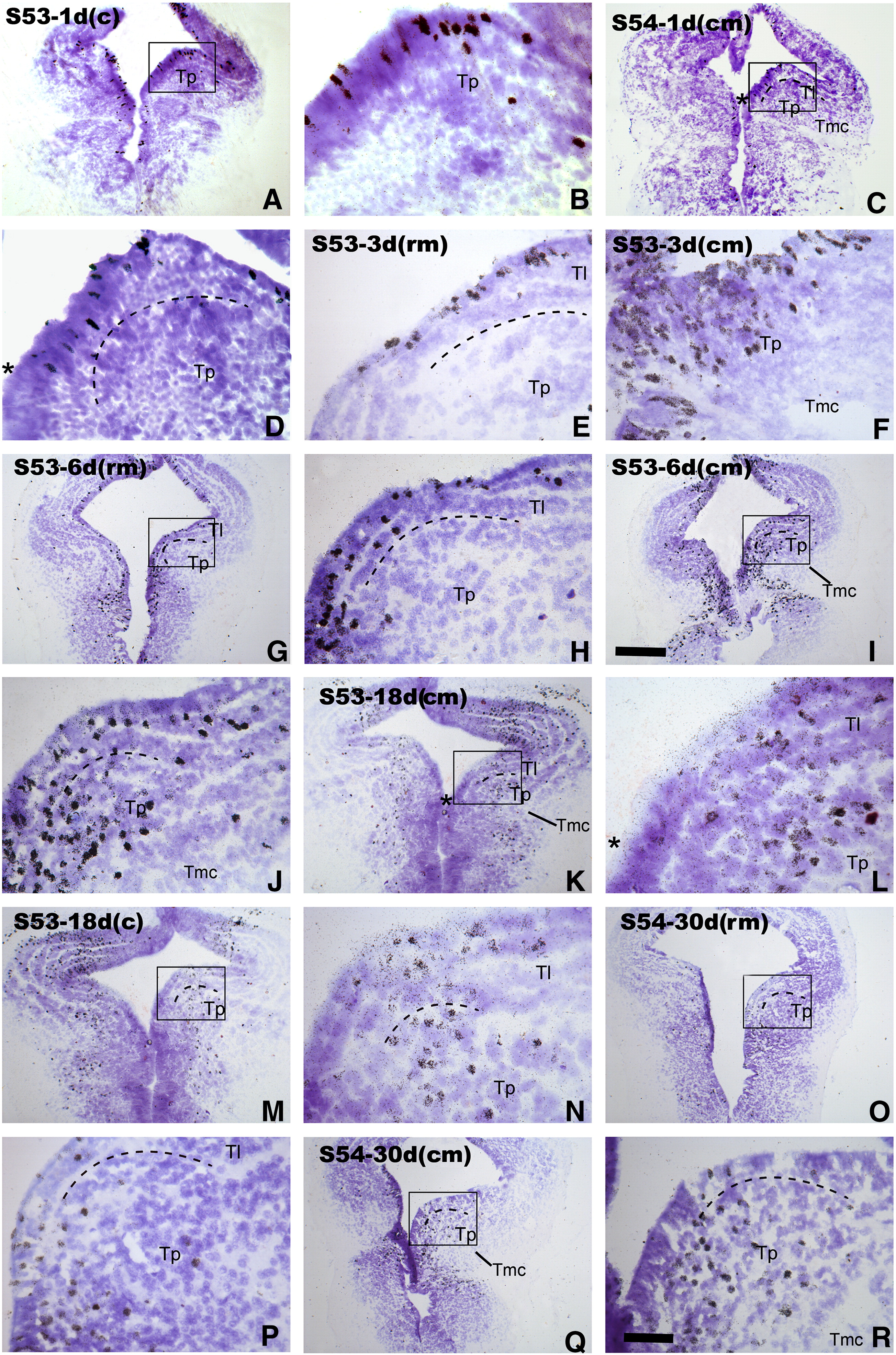 There is a clear core-shell organization in the auditory nuclei of amniotes. However, such organization only exists in the mesencephalic, but not in the diencephalic auditory regions of amphibians. To gain insights into how this core-shell organization developed and evolved, we injected a small dose of [(3)H]-thymidine into tadpoles of Xenopus laevis at peak stages of neurogenesis in the mesencephalic and diencephalic auditory areas. Following different survival times, the germinal sites and migrating routes of cells were examined in the shell (laminar nucleus, Tl; magnocellular nucleus, Tmc) and core (principal nucleus, Tp) regions of the mesencephalic auditory nucleus, torus semicircularis (Ts), as well as in the diencephalic auditory areas (posterior thalamic nucleus, P; central thalamic nucleus, C). Double labeling for [(3)H]-thymidine autoradiography and immunohistochemistry for vimentin was also performed to help determine the routes of cell migration. We found three major results. First, the germinal sites of Tp were intercalated between Tl and Tmc, arising from those of the shell regions. Second, although the germinal sites of Tl, Tmc, and Tp were located in the same brain levels (at rostromedial or caudomedial levels of Ts), neurogenesis in Tl or Tmc started earlier than that in Tp. Finally, the P and C were also generated in different ventricle sites. However, unlike Ts their neurogenesis showed no obvious temporal differences. These data demonstrate that a highly differentiated auditory region, such as Tp in Ts, is lacking in the diencephalon of amphibian. Our data are discussed from the view of the constitution and evolutionary origins of auditory nuclei in vertebrates.