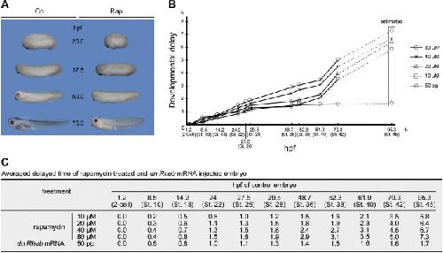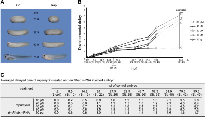 The effects of TOR signal by rapamycin treatment and dn-Rheb mRNA on developmental speed. (A) Simple comparison of control and rapamycin-treated embryos at same time-course. In embryos treated with rapamycin (20 μM) from 2-cell stage, developmental speed was clearly delayed (100%, n = 15). (B) Time-course of developmental delay following rapamycin treatment. In embryos exposed to each test solution (10, 20, 40, and 80 μM), developmental delays were dose-dependently increased (100%, n = 15, 100%, n = 15, 100%, n = 15, and 100%, n = 15). Same effect was observed in dn-Rheb mRNA (50 pg) injected embryo (100%, n = 15). Refer to the scores before stage 42, the estimated delayed times for stage 45 (95.3 hpf in control embryo) were calculated because structural differences induced by rapamycin made collect staging difficult at this stage. Each stage was determined as follow. Stage 10 was determined when blastopore pigmentation is first detected at the dorsal side. Stage 13 when the blastopore was completely closed. Stage 22 when the neural fold was perfectly closed. Stage 26 when dorsal axis was straighten, and primary melanocyte and optic vesicle bump were observed. Stage 28 when fin structure was first observed. Stage 36 when eyes and cement gland were observed clearly and darkly. Stage 38 when fin region was expanded to 50% of trunk-tail. Stage 40 when boundary between posterior yolk and fin was vertically located. Stage 42 when a part of ventral fin was clearly appeared anterior to anus regions. Stage 45 when coiled-coil structure was observed in gut region. (C) Table for B. Rapamycin treatments were performed after 2-cell stage before control embryos reached scheduled stage. dn-Rheb mRNA was microinjected at 2-cell stage. Every 15 min we counted number of embryos that already reached scheduled stage. Using these scores, each averaged arrival time for scheduled stages was calculated.