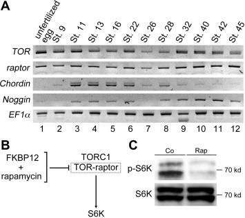 Inhibition of Xenopus TOR activity by rapamycin treatment. (A) RT-PCR analyses for TOR and raptor mRNA expressions from unfertilized egg to larva stage. Both TORC1 components are consecutively expressed in Xenopus embryo. (B) Generally conserved model of TORC1 inhibition by rapamycin. Structure of the FKBP12-rapamycin complex interacts with TORC1 in which TOR and raptor are major components. S6 kinase (S6K) is the major output signal activated by TORC1. (C) Western blot analysis of phospho-S6 kinase (p-S6K) in rapamycin-treated embryos. Embryos were treated at 2-cell stage with 80 μM of rapamycin, and extract was collected at stage 42.