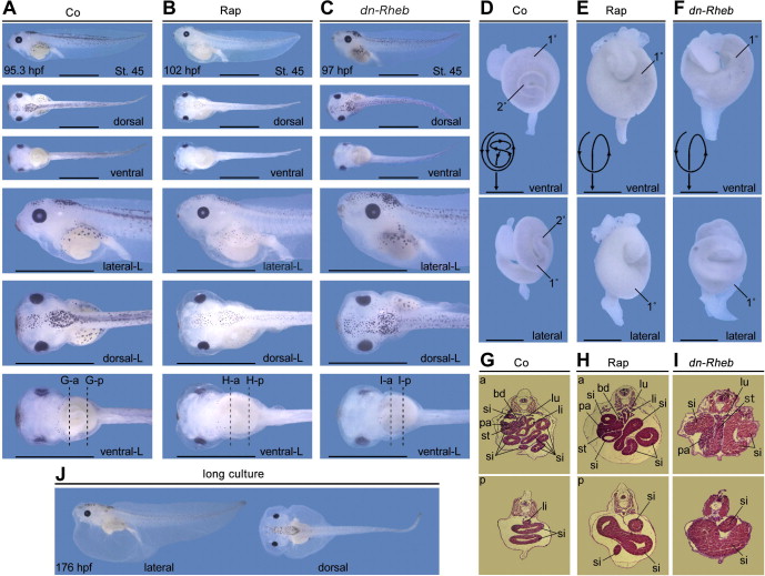 Gastrointestinal malformation induced by rapamycin treatment and dn-Rheb mRNA injection. (A) Control embryo at stage 45 (95.3 hpf) for B and C. (B) Rapamycin-treated embryo at stage 45. Embryos were treated with 40 μM of rapamycin and cultured. Pigmentation defects were stronger than Stage 42. Both size and shape of gut were affected by rapamycin treatment (100%, n = 15). (C) dn-Rheb mRNA (200 pg) injected embryo at stage 45. Both size and shape of gut were also affected by dn-Rheb mRNA injection (100%, n = 15), but pigmentations were observed like control. Dotted lines mean sectioned sites for histological analyses shown in GâI. (DâF) Surgically-resected guts from embryos shown in AâC. Upper and under panels respectively indicate ventral and dorsal views. Secondary coiled structure of gut was not detected in rapamycin-treated and dn-Rheb mRNA injected embryos. 1°, primary coil; 2°, secondary coil. The diagram of gut structure was shown on the bottom-left corner. (GâI) Histological sections created from embryos shown in AâC. In both rapamycin-treated and dn-Rheb mRNA injected embryos, gut formations were disordered and thicker than the case of control embryo. bd, bile duct; li, large intestine; lu, lungs; pa, pancreas; si, small intestine; st, stomach. (J) Long cultured embryos in 20 μM of rapamycin (176 hpf). All embryos were swollen like balloon but survived until 200 hpf maximum. The scale bars of A, B, and C and of D, E, and F represent 2 mm and 0.5 mm, respectively.
