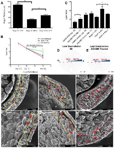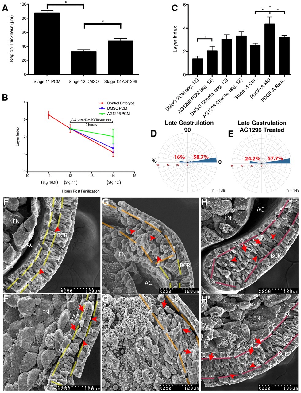 Fig. 2. PDGF-A inhibition disrupts PCM radial intercalation. (A) The PCM thins significantly (P<0.0001, n=10 embryos/stage) between stages 11 and 12; thinning is reduced upon AG1296 treatment (P<0.0001, n=10 embryos). (B) The change in layer index of PCM over time and following AG1296 treatment at stage 11. (C) The PCM layer index is significantly higher at stage 12 following AG1296 treatment (P=0.0013, n=13 embryos) or at stage 11 in PDGF-A MO-injected embryos (P<0.0001, n=12 embryos); chordamesoderm is unaffected (P=0.0886, n=13 embryos). (A-C) Error bars represent s.d., asterisks indicate significant results. (D,E) Orientation of chordamesoderm cells: BCR, 0°; n=number of cells. No significant difference between (D) controls and (E) AG1296-treated embryos (P=0.9842). (F-Hâ²) Sagittally fractured stage 12 embryos treated with DMSO (F-H) or 10 μM AG1296 (Fâ²-Hâ²) 2 hours prior to fixation; broken lines indicate region boundaries. (F) Red arrowheads indicate PCM cells in a single layer in DMSO controls. (Fâ²) Red arrowheads indicate superficial PCM cells in contact with the BCR; red arrows indicate a second layer of cells in AG1296-treated embryos. (G,Gâ²) Red arrowheads indicate LEM cells oriented perpendicular to the BCR in controls (G) and obliquely oriented LEM cells in AG1296-treated embryos (Gâ²). (H,Hâ²) Red arrowheads indicate chordamesoderm cells extending protrusions towardsthe BCR; red arrows indicate cells extending protrusions toward the archenteronepithelium. BCR, blastocoel roof; EN, endoderm; AC, archenteron.