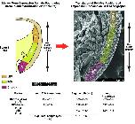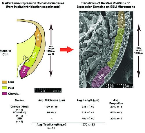 Fig. S1. Mapping of normal marker gene expression domains onto scanning electron micrographs. Average length and width dimensions of Xbra (chordamesoderm) and Gsc (PCM) expression domains were measured from in situ hybridization images. The lengths of the expression domains varied (see standard deviations); thus, their average lengths were determined, and the percentage of total mesoderm length occupied by each domain was used to map domains onto the SEM pictures. Standard deviations were of the order of one to two cell diameters. The widths of domains varied little, and average values were used directly. The domains thus defined corresponded well to anatomical boundaries between ectoderm and mesoderm (Brachet�s cleft) on one side, and large endoderm cells or the archenteron epithelium on the other. No unambiguous markers were available to distinguish between LEM and deep endoderm, and no distinct boundary was visible. For practical purposes, we extended the PCM-endoderm boundary anteriorly in parallel to the BCR, probably underestimating the width of the LEM. The table shows average length, width and average proportion values with standard deviations for the different regions of the normal mesoderm. This method was used for all experiments, in connection with respective in situ hybridization data. Purple, chordamesoderm (xBra); yellow, pre-chordal mesoderm (Gsc); orange, leading edge mesoderm (non-Gsc, Cer expressing).