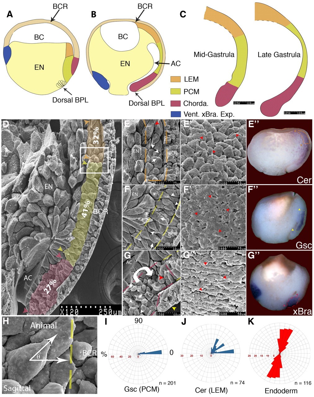 Fig. 1. Dorsal mesoderm during gastrulation. (A,B) Diagrams of (A) stage 10 (early gastrulation) and (B) stage 12 (late gastrulation); ventralXbra expression is in blue. (C) Mesoderm regions at mid and late gastrulation, traced from SEM pictures. Scale bar: 120 μm. (D) SEM micrograph of sagittally fractured stage 11 embryo. Purple, chordamesoderm; yellow, PCM; orange, LEM. The percentage of the total mesoderm length occupied by each region is indicated. White box, transition between PCM and LEM. (E-G) High-magnification SEM images of (E) LEM, (F) PCM and (G) chordamesoderm from sagittally fractured stage 11 embryo; broken lines indicate boundaries of mesoderm regions. Cells extend protrusions in (white arrowheads) and out (white arrows) of the plane of the image. Red arrowhead in E indicates a cell with oblique orientation near the leading edge. Curved arrow in G indicates the direction of mesoderm internalization. Red arrowhead in G indicates a cell oriented perpendicular to the BCR at the anterior border of the region. (Eâ²-Gâ²) SEM images of (Eâ²) LEM, (Fâ²) PCM and (Gâ²) chordamesoderm at stage 11, showing the surface previously in contact with the BCR. (Eâ²) Red arrowheads indicate cells extending protrusions animally in a shingle arrangement. (Fâ²) Red arrowheads indicate non-oriented cellular protrusions. (Gâ²) Red arrowheads indicate bipolar cells in mediolateral orientation. (Eâ²-Gâ²) In situ hybridization for (Eâ²) Cer, (Fâ²) Gsc and (Gâ²) Xbra; broken lines and arrowheads show region boundaries. (H) The angle (θ) between protrusion and the BCR as a measure of cell orientation. (I-K) Rose diagrams representing the percentage of cells extending protrusions (I,J), or the long axis (K) oriented with respect to BCR. 0° is towards the BCR, 90° toward the animal pole; n, number of cells; BCR, blastocoel roof; BPL, blastopore lip; BC, blastocoel; PCM, prechordal mesoderm; EN, endoderm; AC, archenteron; LEM, leading edge mesendoderm; Chorda, chordamesoderm.
