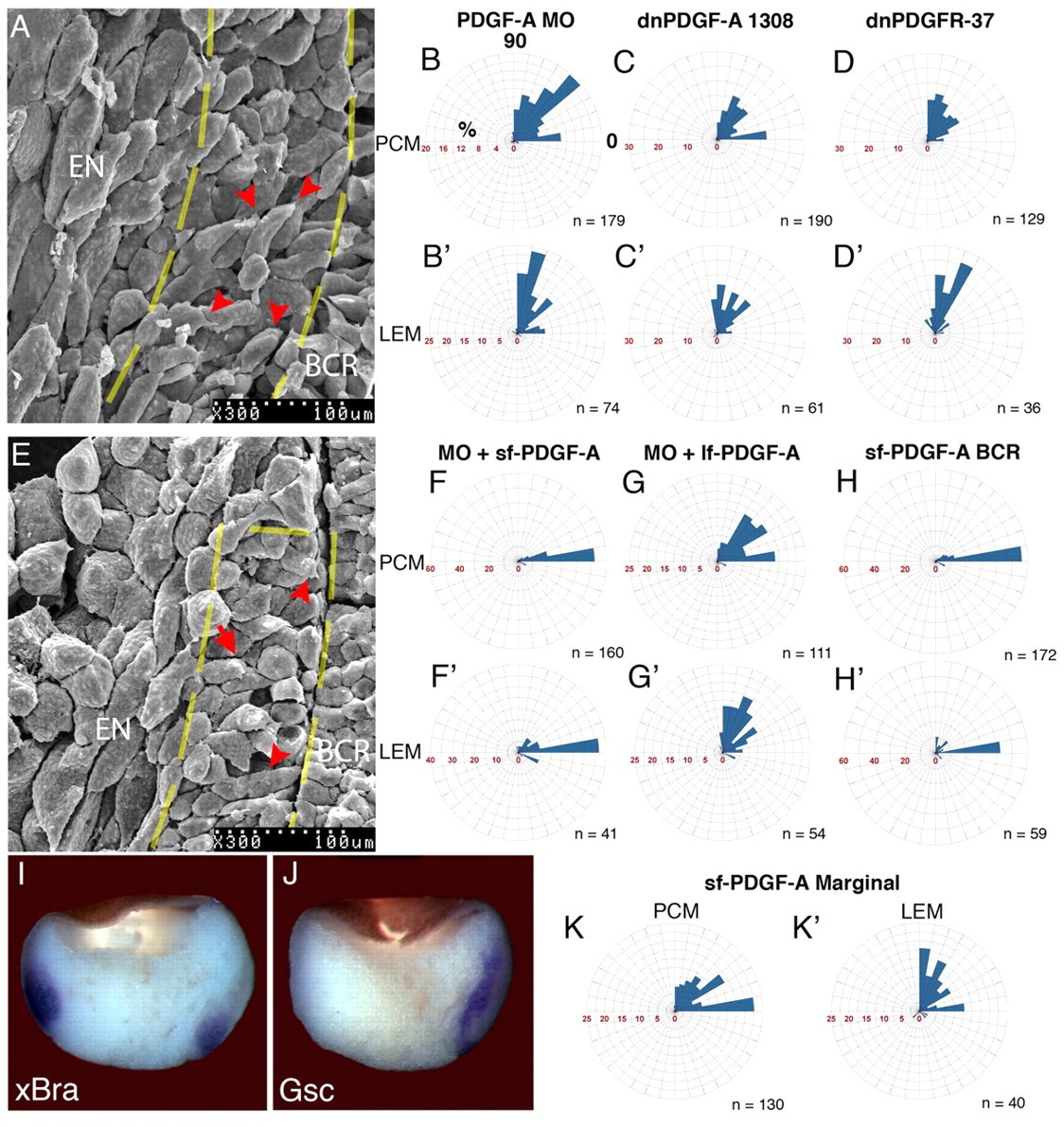 Fig. 4. sf-PDGF-A is required for radial orientation of PCM cells. (A) A sagittally fractured stage 11 embryo injected with 60 ng PDGF-A morpholino; cells are oriented parallel to the BCR (red arrowheads). The broken yellow lines indicate region boundaries. (B-Dâ²,F-Hâ²) Orientation of PCM cells (B-D,F-H) and LEM cells (Bâ²-Dâ²,Fâ²-Hâ²) from embryos injected with (B,Bâ²) 60 ng PDGF-A morpholino, (C,Câ²) 1.6 ng of dominant-negative PDGF-A 1308 RNA, (D,Dâ²) 400 pg of dominant-negative PDGFR-37 RNA, (F,Fâ²) 60 ng PDGF-A MO + 800 pg sf-PDGF-A RNA, (G,Gâ²) 60 ng PDGF-A MO + 800 pg lf-PDGF-A RNA or (H,Hâ²) 800 pg sf-PDGF-A RNA. (E) Sagittally fractured stage 11 embryo co-injected with PDGF-A MO and sf-PDGF-A mRNA. Cells extend protrusions towards the BCR in (red arrowheads) and out (red arrows) of the plane of the image; the broken yellow line indicates the region boundary. (I,J) In situ hybridization for (I) Xbra and (J) Gsc from embryos injected with 60 ng PDGF-A MO. (K,Kâ²) Orientation of cells from embryos injected with 400 pg of sf-PDGF-A mRNA in the mesoderm. n, number of cells per region; 0° and 90° correspond to BCR and animal pole, respectively. EN, endoderm; PCM, prechordal mesoderm; LEM, leading edge mesendoderm.