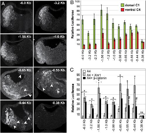 Fig. 3. Mapping Nodal and Wnt-responsive cis-elements. (A) Representative examples of GFP fluorescence from hhex:gfp deletion constructs in bisected transgenic gastrulae. Arrowheads show ectopic GFP. (B) Relative luciferase activity of early gastrulae injected with hhex:luc deletion constructs into either dorsal C1 (green), the ventral C4 cells (red) or (C) into the A4 ectoderm cells with xnr1 RNA (50 pg; gray) or stabilized pt-β-catenin RNA (250 pg; black). (BâC) Histograms show the average normalized luciferase activity and standard deviation from injections performed in biological triplicate. Representative examples from 3 independent experiments are shown. *p < 0.05 in Student T-tests when compared to injection of the same reporter alone; ns = no statistical difference. The NRE localized between â0.44 and â0.38 Kb, and the WRE between â0.65 and â0.55 Kb. |