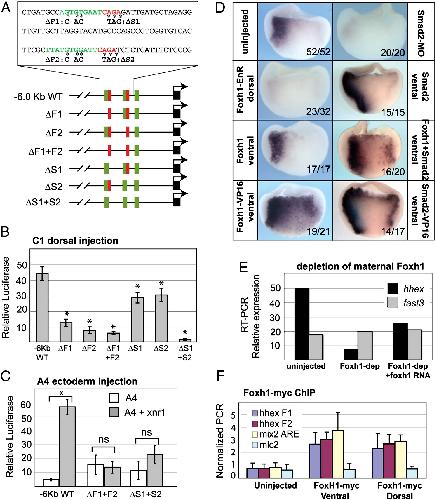 Fig. 5. Nodal-signaling directly activates hhex transcription through Foxh1/Smad2 binding in the proximal â0.44 Kb promoter. (A) Schematic and sequence of the NRE indicating the putative Foxh1 (green) and Smad (red) DNA-binding sites and corresponding âF and âS mutations. (BâC) Relative luciferase activity in gastrulae injected with the indicated reporter constructs into (B) the C1 dorsal mesendoderm or (C) the A4 ectoderm along with or without xnr1 RNA (50 pg). Histograms show the average normalized luciferase activity and standard deviation from a single injection experiment performed in biological triplicate. A representative from 3 independent experiments is shown. *p < 0.01 in Student T-test in (B) compared to the wt reporter or in (C) compared to injection of the same reporter alone; ns = no statistical difference. (D) Foxh1 and Smad2 regulate endogenous hhex expression. Hhex in situ of gastrulae injected into either dorsal or ventral cells with: foxh1-EnR RNA (500 pg), foxh1-VP16 RNA (200 pg), Smad2a/b -MOs (20 ng each), Smad2-VP16 RNA (200 pg) foxh1 RNA (250 pg), smad2 RNA (250 pg), or foxh1 + smad2 RNAs (125 pg each). (E) Normalized QRT-PCR of hhex and fast3 mRNA levels in gastrulae depleted of maternal Foxh1 and rescued by co-injection of foxH1 RNA (100 pg). (F) Normalized QPCR analysis of chromatin immunoprecipitated (in triplicate) from gastrulae injected dorsally or ventrally with Myc-Foxh1 RNA (50 pg). Primers amplified genomic DNA fragments containing the F1 or F2 Foxh1-sited in the hhex NRE, the mix2 ARE as a positive control and mlc2 promoter as a negative control. |