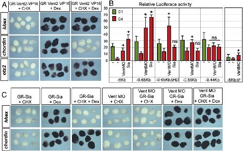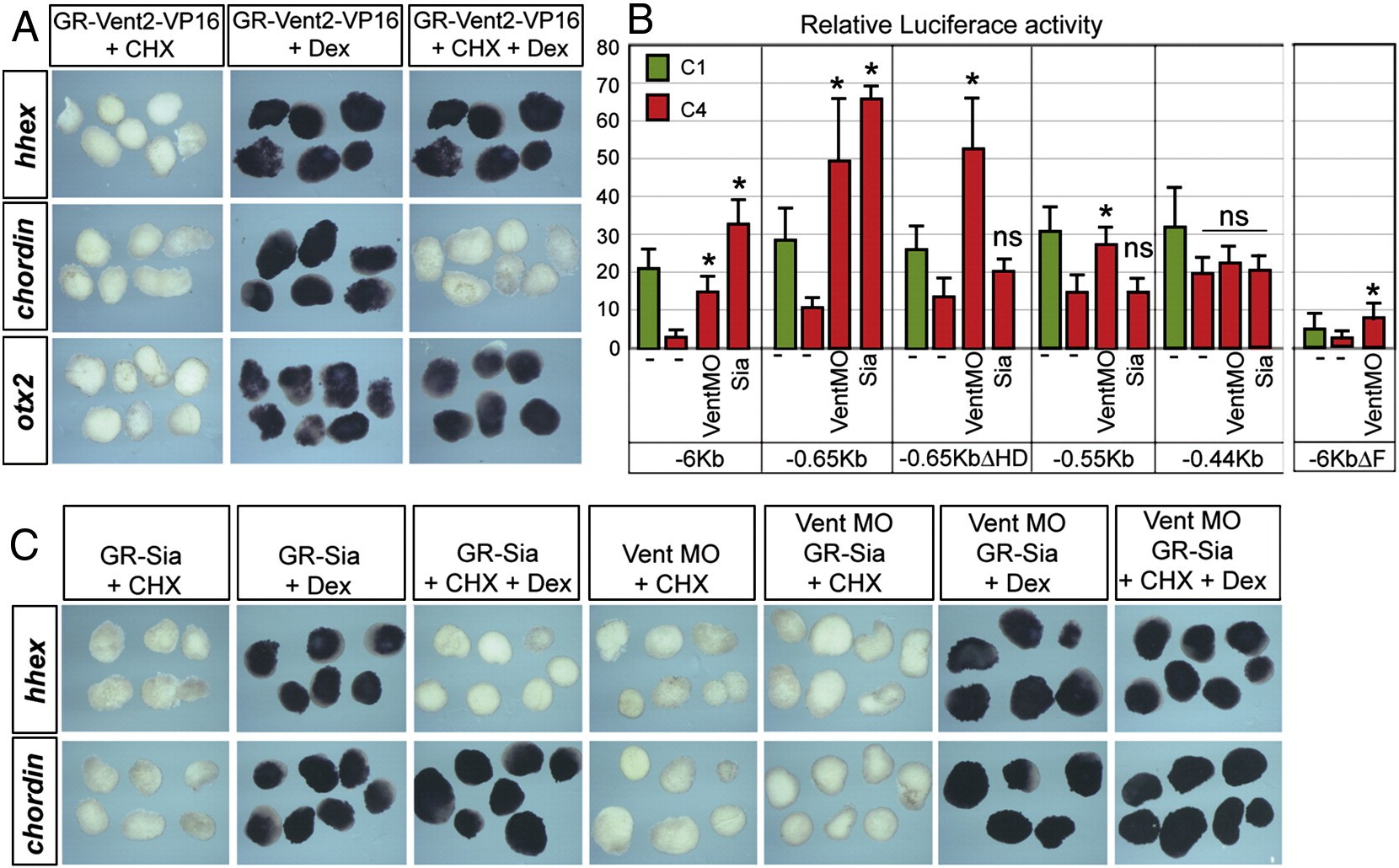 Fig. 9. Vent and Sia directly act on the hhex promoter. (A) Animal cap explants injected with GR-Vent2âVP16 RNA (100 pg) were cultured with or without CHX for 30 min and then treated with DEX. In situ hybridization at stage 11 shows that hhex and otx2, but not chordin, were directly induced by GR-Vent2âVP16 in CHX-treated explants. (B) The indicated hhex:luc reporters were injected into either C1 dorsal (green) or C4 ventral cells (red), with either Vent1/2-MOs (30 ng each) or Sia mRNA (50 pg). The histogram shows the average normalized luciferase activity at stage 10.5 and standard deviation from a single representative injection experiment performed in biological triplicate. *p < 0.05 in Student T-test when compared to injection of reporter alone and ns = no statistical difference. A representative example of 3 independent injection experiments is shown. (C) GR-Sia can directly activate hhex transcription in Vent-depleted animal caps. Animal caps injected with GR-sia RNA (30 pg) with or without Vent1/2-MOs (30 ng each) were cultured with CHX, DEX, or CHX + DEX followed by in situ hybridization at stage 11 for hhex or chordin mRNA. (A, C) Animal cap experiments were repeated twice with identical results and a total of ~ 10 explants/condition. One experiment is shown. |