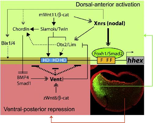 The homeobox gene hhex is one of the earliest markers of the anterior endoderm, which gives rise to foregut organs such as the liver, ventral pancreas, thyroid, and lungs. The regulatory networks controlling hhex transcription are poorly understood. In an extensive cis-regulatory analysis of the Xenopus hhex promoter, we determined how the Nodal, Wnt, and BMP pathways and their downstream transcription factors regulate hhex expression in the gastrula organizer. We show that Nodal signaling, present throughout the endoderm, directly activates hhex transcription via FoxH1/Smad2 binding sites in the proximal -0.44 Kb promoter. This positive action of Nodal is suppressed in the ventral-posterior endoderm by Vent 1 and Vent2, homeodomain repressors that are induced by BMP signaling. Maternal Wnt/β-catenin on the dorsal side of the embryo cooperates with Nodal and indirectly activates hhex expression via the homeodomain activators Siamois and Twin. Siamois/Twin stimulate hhex transcription through two mechanisms: (1) they induce the expression of Otx2 and Lim1 and together Siamois, Twin, Otx2, and Lim1 appear to promote hhex transcription through homeobox sites in a Wnt-responsive element located between -0.65 to -0.55 Kb of the hhex promoter. (2) Siamois/Twin also induce the expression of the BMP-antagonists Chordin and Noggin, which are required to exclude Vents from the organizer allowing hhex transcription. This study reveals a complex network regulating anterior endoderm transcription in the early embryo.