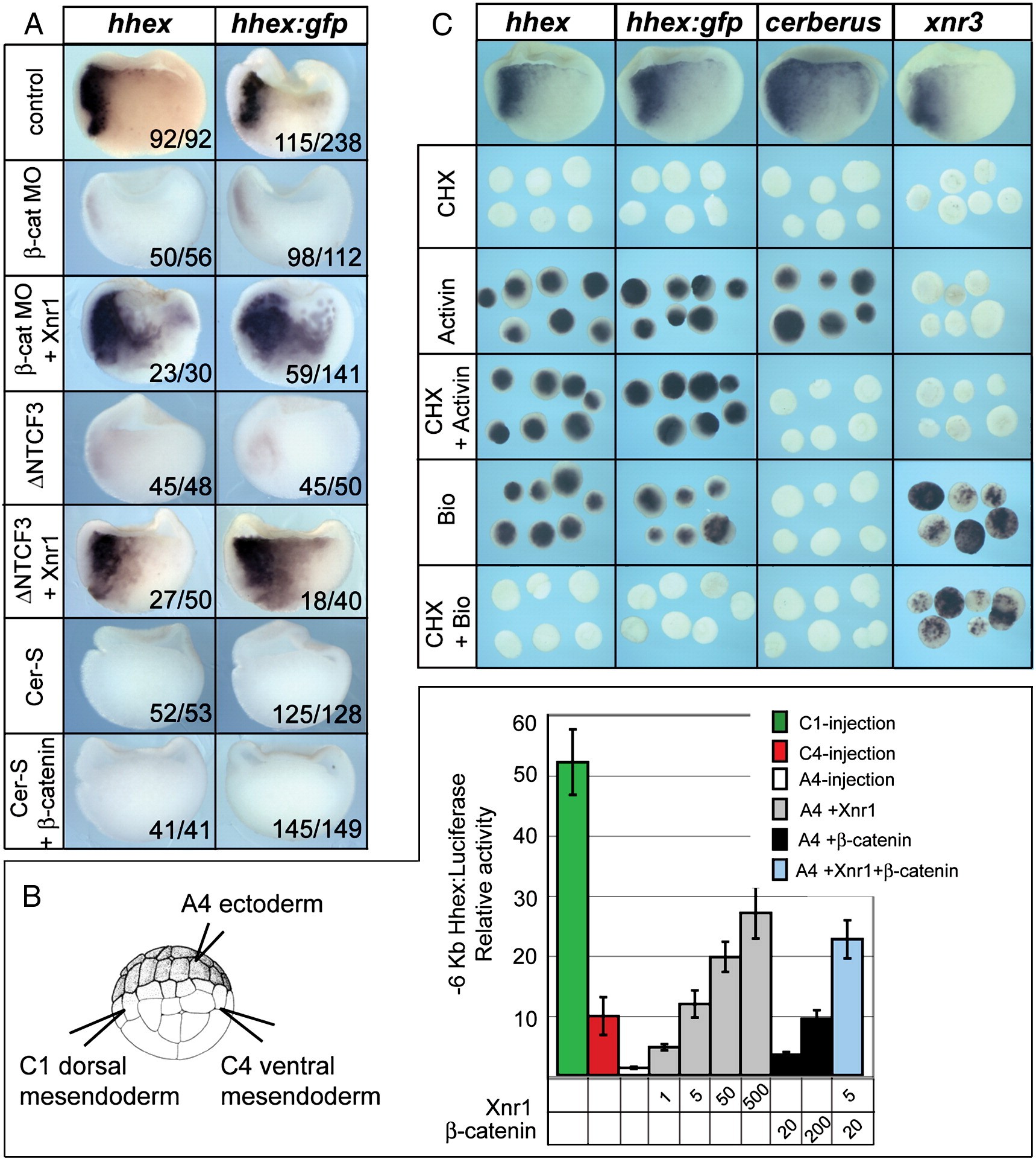 Fig. 2. Regulation of hhex expression by Nodal and Wnt/β-catenin signaling. (A) Nodal and Wnt signaling are required for hhex expression. In situ hybridization of hhex and gfp in bisected â6.0Kb:hhex:gfp transgenic gastrulae injected with β-catenin-MO (20 ng), âNtcf3 RNA (500 pg), stabilized pt-β-catenin RNA (250 pg), xnr1 RNA (50 pg), and/or cer-s RNA (750 pg). The number of embryos exhibiting the depicted phenotype is indicated. Transgenic F1 males are heterozygous, and approximately 50% of the embryos are expected to express gfp. (B) The schematic indicates the cells injected with the hhex:luc reporter (300 pg) plus pRL-TK:Renilla (25 pg). Co-injection with xnr1 RNA (1â500 pg) and/or β-catenin RNA (20â200 pg) resulted in a dose-dependent activation the hhex:luc reporter in the ectoderm. The histogram shows the average normalized luciferase activity and standard deviation from a single injection experiment performed in biological triplicate. A representative example of 4 independent experiments is shown. (C) hhex is a direct Nodal-target and an indirect Wnt-target. Blastula stage animal cap tissue was cultured either untreated, with Activin or with BIO. Some explants were incubated in CHX for 30 min prior to and during culture to block protein synthesis. At stage 11, the animal caps were assayed by in situ for hhex, gfp, cerb, and xnr3. This experiment was repeated 3 times, with identical results and a total of 12â15 caps per treatment. A representative example is shown. |