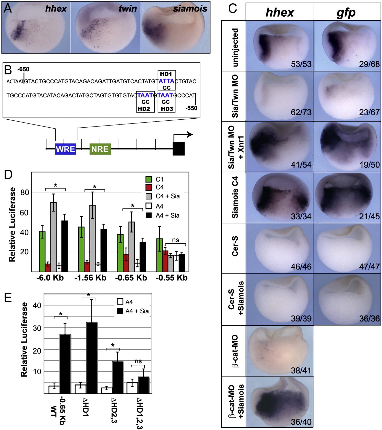 Fig. 6. Sia/Twn act downstream of Wnt/β-catenin to activate the WRE. (A) In situ hybridization of hhex, twin, and siamois in bisected blastula. (B) Schematic and sequence of the WRE indicating the homeobox sites (HD) and the âHD mutations. (C) In situ hybridization of hhex or gfp in bisected â6.0Kb:hhex:gfp transgenic gastrulae injected as follows: a combination of Sia-MO and Twn-MO (20 ng each; dorsal at 4-cell), Sia/Twn-MOs (20 ng each; dorsal at 4-cell) + xnr1 RNA (50 pg; dorsalâvegetal at 8-cell), sia RNA (25 pg; ventral 4-cell), cer-S RNA (500 pg; dorsal 4-cell) to block Nodal signaling, cer-S + sia RNA (500 pg + 25 pg; dorsal 4-cell), β-catenin-MO (20 ng; 2-cell) and β-catenin-MO (20 ng; 2-cell) + sia RNA (50 pg; dorsalâvegetal at 8-cell). (DâE) Sia activates hhex transcription via HD sites in the WRE. Embryos were injected with the indicated hhex:luc constructs into either the C1 dorsal mesendoderm, the C4 ventral mesenoderm or the A4 ectoderm, with or without sia RNA (25 pg). Histograms show the average normalized luciferase activity and standard deviation at stage 10.5 from a single injection experiment performed in biological triplicate. A representative from 3 independent experiments is shown. *p < 0.01 in Student T-test compared to injection of the same reporter alone and ns = no statistical difference. |