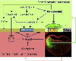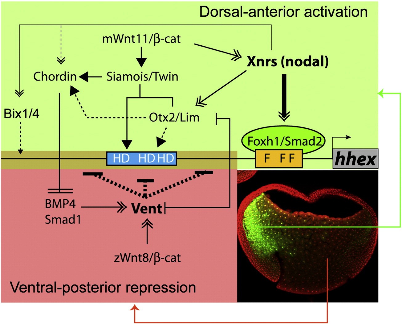 Fig. 10. A model of the regulatory network controlling hhex transcription. The Nodal and mWnt pathways leading to activation of hhex transcription in the dorsal–anterior endoderm are shown in the green box. Repression of hhex transcription by BMP, zygotic Wnt8, and Vents are shown in the red box. Interactions mediated by secreted factors are indicated by hatched arrows, and interactions not yet known to be direct are indicated by dashed lines. The Nodal- and Wnt-responsive cis-elements are indicated in orange and blue boxes, respectively. |