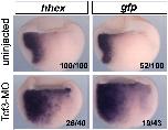 Figure S2. Hhex expression is up regulated in Tcf3-depleted embryos. In situ hybridization to hhex or gfp mRNA in bisected â6.0Kb:hhex:gfp transgenic gastrulae injected with a Tcf3-MO (60 ng). Mating a wild-type female to a heterozygous â6.0Kb:hhex:gfp male approximately 50% of the embryos carry the transgene. |