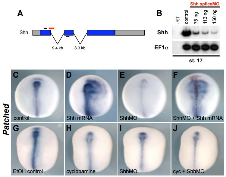 Fig. S2. Shh MO efficiently and specifically blocks Shh function. (A) Schematic of Shh transcript with exons (blue), introns (Vs), and UTRs (gray) shown. âShh spliceMOâ (red) was designed to overlap the first splice donor site. RT-PCR primers (black) were designed flanking the splice junction to assay for correct splicing. (B) RT-PCR of embryos injected with Shh spliceMO shows dose-dependent reduction of Shh splicing. EF1α serves as a loading control. (CâJ) ISH for Hh pathway target genes Patched1/2. Shh mRNA upregulates Ptc (D), while Shh MO reduces Ptc (E). Reduction by Shh MO is specific, as it can be rescued by co-injection of Shh mRNA (F). In a separate round of experiments, cyclopamine treatment shows a similar amount of Ptc reduction (H) to Shh MO (I). Combination of these reagents does not enhance the phenotype (J), indicating that maximal possible knockdown of Shh function is achieved by either Shh MO or cyclopamine alone. |