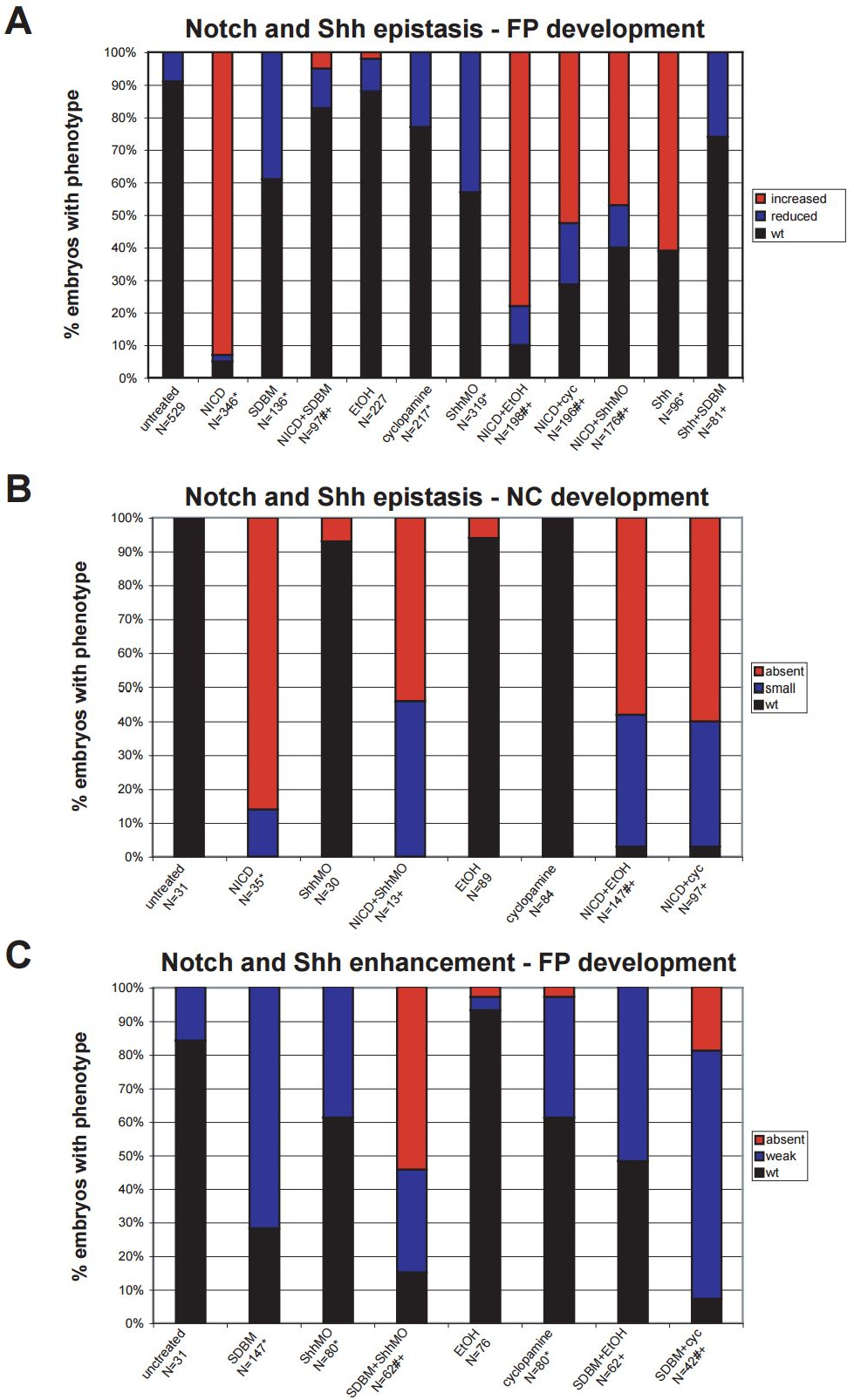 Fig. S5. Notch and Shh signaling operate in parallel to specify floor plate, but Shh signaling is not required for Notch repression of notochord. Quantification of results shown in Fig. 6. Embryos were injected and/or treated as indicated. At stage 20â22, embryos were fixed, bisected, stained for lacZ lineage tracer, and assayed for FP by Netrin ISH (A, C) and for notochord by Tor70 staining (B). We scored FP development by the intensity of Netrin staining and notochord development by the size of the Tor70+ structure. Total percentages of embryos of each phenotype (see Fig. 6) are represented by stacked column graphs. N is the number of bisected embryos scored in at least 2 independent experiments. For determination of statistical significance, Ï2 tests were performed pairwise between 1) controls and single reagents and 2) double treatments and each single component. * significant difference from control, p < 0.05. # significant difference from NICD/SDBM, p < 0.05. + significant difference from other reagent, p < 0.05. |