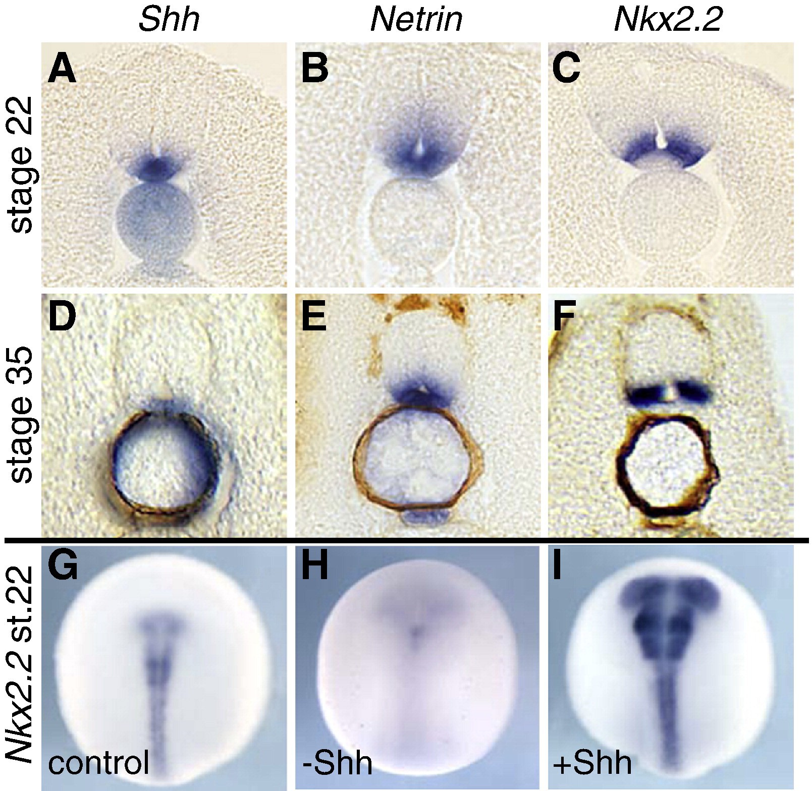 Fig.5. Lateral floor plate is regulated by Shh signaling. Nkx2.2 is a marker of the LFP in zebrafish and chick. At onset in frog (stage 22), it is expressed in two stripes in the ventral neural tube (C) lateral to Shh (A) and Netrin (B). At tadpole stages, Shh (D), Netrin (E), and Nkx2.2 (F) clearly mark distinct domains. LFP formation requires Shh signaling (H) and Shh overexpression can induce ectopic Nkx2.2 throughout the brain and upregulation in the spinal cord (I) at stage 22. (AâF) Transverse vibratome sections following ISH and Tor70 staining of the notochord (brown, DâF). (GâI) Dorsal views, anterior up. |