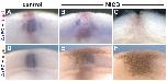 Fig. S4. Perturbation of S/Hh signaling only affects the floor plate of the brain. Lateral views of tailbud stage control (A, D), cylopamine-treated (B, E), and Shh mRNA injected (C, F) embryos, processed by ISH for F-spondin (AâC) and FoxA2 (DâF) and stained for notochord (Tor70, brown, AâC). Loss of Hh signaling results in reduced (E) or broken (B) staining of floor plate markers in the brain in 48% of cyclopamine-treated embryos (N = 149). Shh mRNA does not cause dorsal expansion of floor plate except in the brain (arrows, C and F). Pink in C, F is staining for co-injected lineage tracer. |