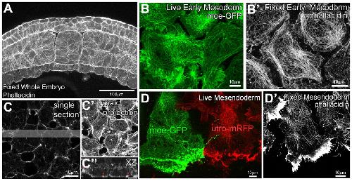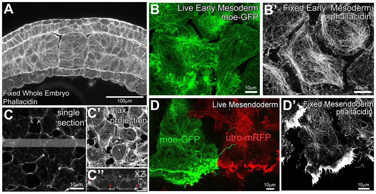 Fig.2. Cortical actin cytoskeleton. (A) Maximum intensity projection of 10-μm thick confocal volumes (20 sections at 0.5 μm intervals) of F-actin stained with phallacidin from a transverse-sectioned whole embryo fixed at stage 12. (B) Single confocal image of live early mesoderm cells (at stage 10.5) expressing moeâGFP. (Bâ²) A single confocal section of F-actin in fixed early mesoderm cells stained with phallacidin. (CâCâ²) A single confocal section of F-actin within the mid-cell body (C), within fixed animal cap ectoderm stained with phallacidin. (Câ²) Maximum intensity projection of 3-μm-thick confocal volume collected through the basolateral F-actin cortex. (Câ²) xz-projection showing the lateral F-actin cortex within a 23-μm-thick confocal volume from the shaded region of C. The red arrowheads in Câ² indicate dense F-actin networks within the basolateral actin cortex. (D) Single confocal image of live mesendoderm cells expressing moeâGFP and utrophinâmRFP. Each cell is the product of a scatter-labeled patch of mRNA-injected cells. The surrounding cells are unlabeled. (Dâ²) The F-actin network in fixed mesendoderm cells stained with phallacidin. |