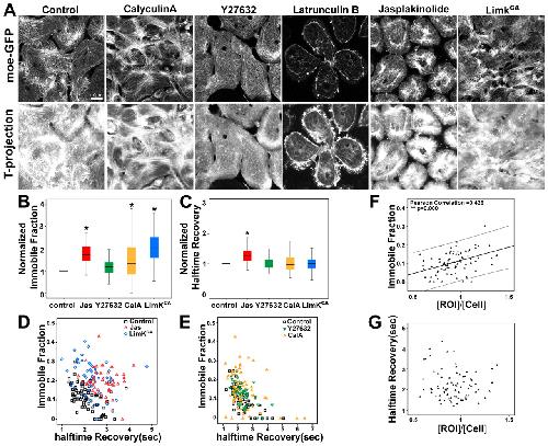 Fig.5. Formation of punctuated F-actin contractions on perturbation of myosin contractility and filamentous actin kinetics. (A) Confocal images from a representative time-lapse sequence of moeâGFP-expressing early mesoderm cells treated with 50 nM CalA, 50 μM Y27632, 0.6 μM LatB, 5 μM Jas or expressing LimKCA. The maximum projection of the time-series of moeâGFP shows the overall levels of F-actin dynamics for 10 minutes during early gastrulation. (B) The immobile fraction (*P<0.001, 56 control and 46 Jas-treated cells) and (C) halftime recovery (*P<0.001, 56 control and 46 Jas-treated cells) are significantly higher in Jas-treated cells than in control cells. (D) Jas-treated cells have significantly higher values for the halftime recovery and immobile fraction compared with control cells. (E) Both Y27632- or CalA-treated cells have similar ranges for both immobile fraction and halftime recovery compared with control cells. (F) The F-actin-rich cortex has a higher immobile fraction after photobleaching within control cells. The x-axis represents the ratio of moeâGFP intensity in the bleached region to the intensity over the entire cell before photobleaching. For control cells, the pre-bleach intensity levels of the bleach area are positively correlated with the immobile fraction [Pearson correlation=0.426 (a slope with 95% confidence interval); **P<0.001, 82 control cells], but shows no correlation with the halftime recovery (G). Note that the immobile fractions (B) and time recovery (C) were normalized to controls in order to compare the different treatments. Raw values for are shown in (D) and (E). |