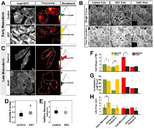 Fig.6. Punctuated F-actin contractions are modulated by non-canonical Wnt-signaling. The dynamics of punctuated F-actin contractions are compared in cells where non-canonical signaling is reduced by Xdd1 or where signaling is stimulated by Xfz7. (A) Punctuated F-actin contractions in moeâGFP-expressing early mesoderm cells (control and Xfz7-expressing cells) exhibit different patterns of frequency and direction of the movements (cm, cell major axis). Note that the calculated orientation of punctuated F-actin contractions from round cells, such as Xfz7-expressing cells (LTW 1.51±0.22) (see supplementary material Tables S1 and S2) are not meaningful when compared with the contraction orientations in elongated cells, such as the late mesoderm cells in (C) (LTW 4.13±1.72). (B) Animal cap ectoderm cells expressing moeâGFP (control, and Xfz7- or Xdd1-expressing cells) and maximum projection of 10-minute time-lapse sequences. (C) Punctuated F-actin contractions in moeâGFP-expressing late mesoderm cells (control and Xdd1-expressing cells) exhibit different patterns of frequency and direction of the movements. ml, mediolateral axis. (D,E) Xfz7-expressing early mesoderm cells have a significantly high immobile fraction than in control cells. (FâH) Quantified results of cell shape, rate and the lifetime of punctuated F-actin contractions from Xfz7- or Xdd1-expressing cells. *P<0.05; ** P<0.01 (see supplementary material Tables S2 and S3). The heat-map colors in (A) and (C) indicate an arbitrary frequency scale from high frequency or high persistence âlightâ to low frequency or low persistence âdarkâ. |
