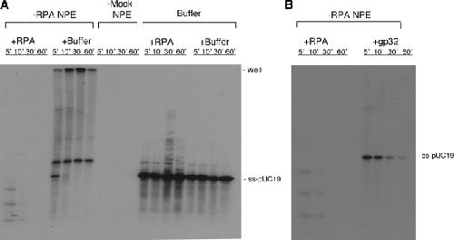 Figure 5. Effect of RPA on 5′ ss-tail degradation. (A) Denatured pUC19 DNA labeled with 32P at the 3′ end was incubated in RPA- or mock-depleted NPE supplemented with buffer or the purified RPA protein. Samples were collected at the indicated times, treated with SDS-EDTA–proteinase K, and separated on a 1% TAE-agarose gel. Two additional reactions containing ss-DNA incubated with the purified RPA protein or buffer, but no NPE, served as controls. (B) Differential activities of RPA and gp32 in supporting ss-DNA degradation. The final concentrations for RPA and gp32 are 0.25 and 1 µM, respectively. |