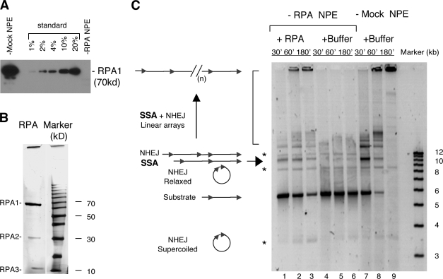 Figure 1. Effect of RPA depletion on SSA. (A) Western blot of RPA- or mock-depleted NPE. RPA was detected with a rat antibody against the large subunit (p70). The standards for quantitation were extracts loaded at the indicated amounts relative to the depleted extracts. (B) Silver staining of the RPA protein purified from Xenopus egg extracts. 0.5 µg of protein was separated by a 12% SDS-PAGE and then detected by silver staining (Bio-Rad Laboratories). The right lane is the protein size marker (Invitrogen). (C) SSA repair in RPA- and mock-depleted NPE. 12 ng/µl of the pRW4* substrate was incubated in RPA- and mock-depleted NPE at room temperature, and the samples taken at the indicated times were treated with SDS-EDTA–proteinase K, separated on a 1% TAE-agarose gel, and detected by SYBR gold staining. The NHEJ products are marked by the asterisks, and the SSA products are marked by the arrow and the bracket. (n) represents multiple repeats. |