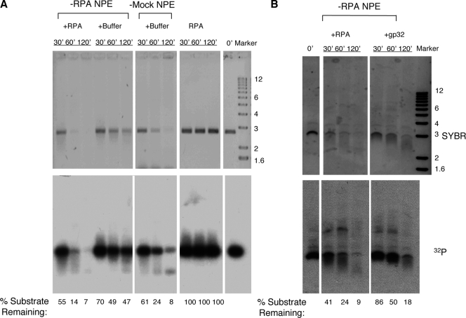 Figure 2. Effect of RPA on DNA end processing. (A) 4 ng/µl of linear pUC19 DNA labeled by [32P]dATP and blocked by ddTTP at the 3′ end was incubated in RPA-depleted NPE (supplemented with either 0.25 µM RPA or buffer) or mock-depleted NPE. One additional reaction, pUC19 incubated with the RPA protein only, served as a control. Samples were taken at the indicated times, treated with SDS-EDTA–proteinase K, and separated on a 1% TAE-agarose gel. The gel was first stained with SYBR gold to detect total DNA and then dried for exposure to phosphoimager to detect 32P. The percentages of the substrate remaining were relative to the zero time point. (B) Differential activities of RPA and gp32 in supporting DNA end processing in RPA-depleted NPE. The final concentrations for RPA and gp32 were 0.25 and 1 µM, respectively. Molecular markers are given in kilobases. |