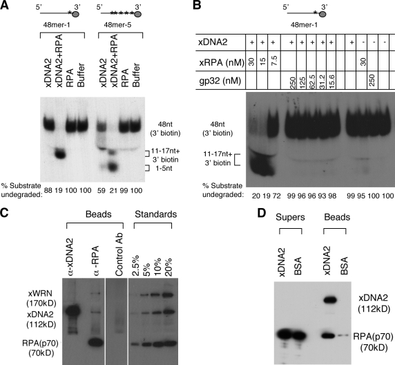 Figure 4. Functional and physical interactions between RPA and xDNA2. (A) The effect of RPA on xDNA2’s 5′→3′ exonuclease activity against two different single-stranded oligonucleotides. The substrates were labeled with 32P-labeled dA (marked by the asterisks) and attached to Streptavidin paramagnetic beads via the 3′ biotin-dC. After incubation at room temperature for 1 h, the reactions were stopped with SDS-EDTA, boiled for 10 min, and separated on a 10% TAE-PAGE. The percentage of the substrate undegraded was relative to the total signal for each reaction. The sizes of the products were determined by separating on a sequencing gel (not depicted). (B) The effect of RPA and T4 gp32 on the nuclease activity of xDNA2. The substrate, 48mer-1 beads, was incubated with various proteins as indicated at room temperature for 1 h and analyzed similarly to that in A. (C) Coimmunoprecipitation of RPA and xDNA2. The immunoprecipitates were separated on an 8% SDS-PAGE, transferred to a polyvinylidene fluoride membrane, and probed for different proteins by Western blotting. For RPA, a rat antibody against the p70 subunit was used for Western blotting. Untreated cytosol was loaded at the indicated amounts to provide the standard for quantitation. White lines indicate that intervening lanes have been spliced out. (D) Interaction between the purified RPA and xDNA2. FLAG beads were precoated with either recombinant xDNA2 or BSA and then incubated with the purified RPA protein. The beads and supernatant fractions were analyzed similarly to that in C. xRPA, Xenopus RPA. Ab, antibody. |