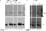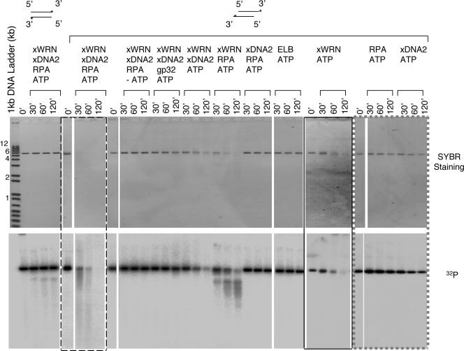 Figure 6. xWNR, xDNA2, and RPA are sufficient to degrade 5′ preprocessed DNA. Purified xWRN, xDNA2, and RPA or gp32 were incubated with blunt-ended DNA or 5′ preprocessed DNA (labeled on the 3′ end) in various combinations in the presence or absence of ATP. Asterisks indicate the 32P label. Samples were taken at the indicated times, treated with SDS-EDTA–proteinase K, and separated on four 1% TAE-agarose gels. The gels were first stained with SYBR gold and then dried for 32P. Reactions from the same gel are indicated by a bounding box, a dashed bounding box, a gray dashed box, or no bounding box. White lines indicate that intervening lanes have been spliced out. Molecular markers shown on the left are given in kilobases. |