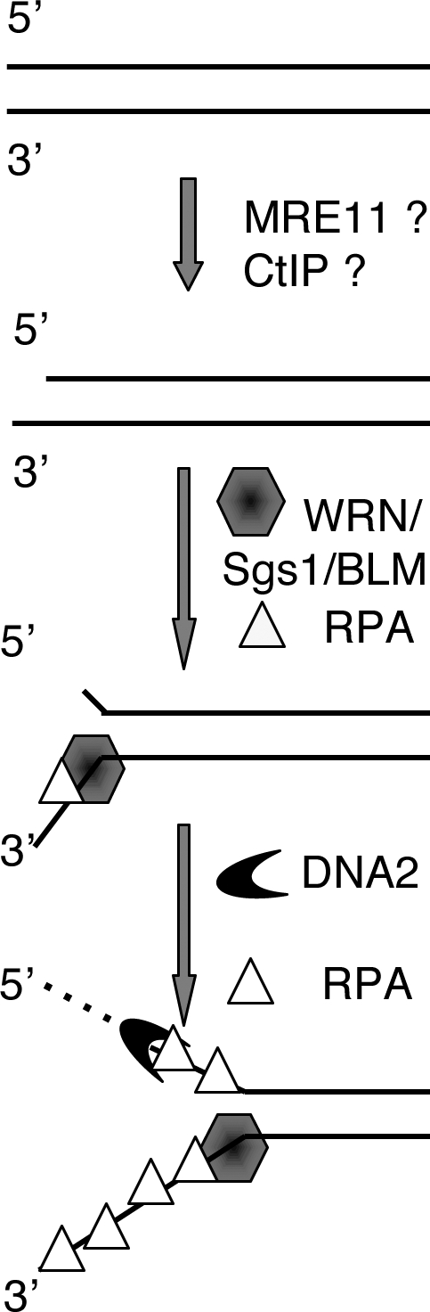 Figure 7. The WRN-DNA2-RPA–mediated DNA end processing pathway. After initial processing by a yet to be defined (probably a MRE11 and CtIP dependent) mechanism, WRN (and other RecQ-type helicases, such as Sgs1 and BLM) unwinds DNA ends. The 5′ ss-tail is then degraded by an ss-DNA exonuclease, such as DNA2. RPA stimulates both reactions. |
