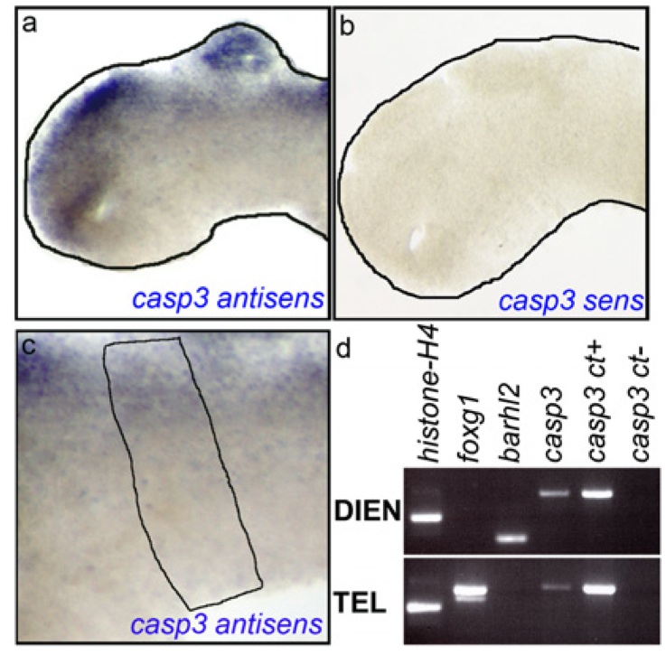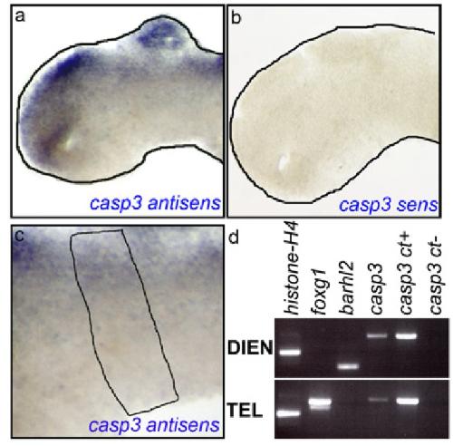 Fig. S1. casp3 and barhl2 are coexpressed in the stage (st) 26 prosomere P2. (AâC) ISH with casp3 antisens (A and C) or casp3 sens (B) probes on st 26 dissected neural tubes. (A and B) At st 26, casp3 is mostly expressed in the telencephalic prospective pallium, in the diencephalic and mesencephalic alar plates of the neural tube, and in the pineal gland. (C) Enlargement of the prosomere P2 area of A. barhl2 expression domain is indicated with a black line. (D) RT-PCR analysis on RNA purified from telencephalic (TEL) or diencephalic (DIEN) st 26 neural tube parts. Foxg1 and barhl2 are pallial TEL and DIEN markers, re- spectively. Histone H4 and the plasmid encoding Casp3 were used as positive controls, and water was a negative control (ct). |